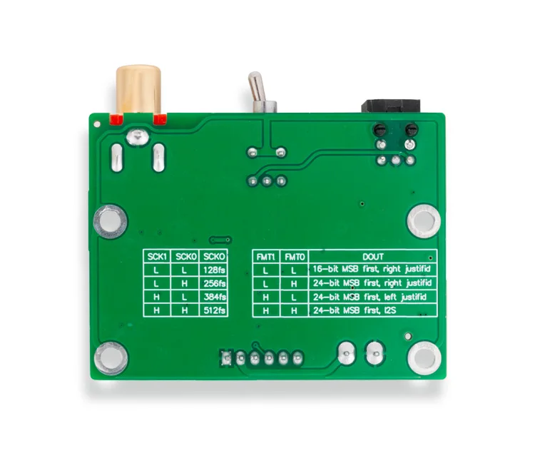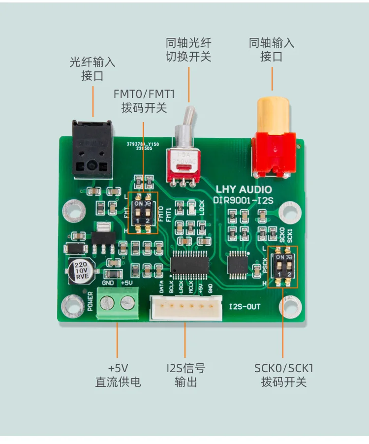 Input interface: coaxial RCA, optical (you can switch between coaxial and optical signals with the on-board DIP switch)