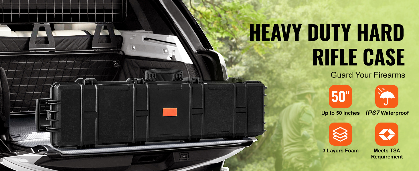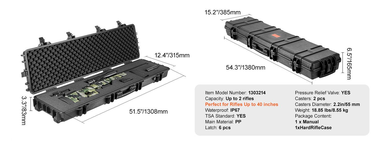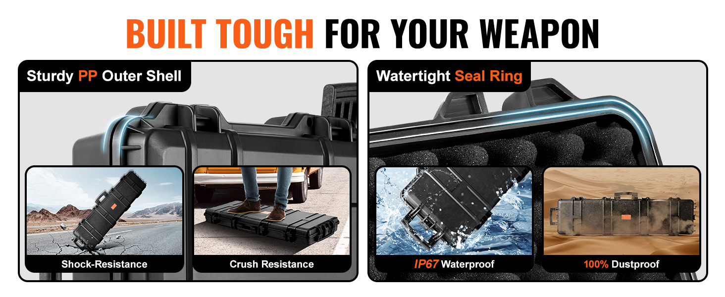 Defend your firearms from damage with this hard-shell rifle gun case. Crafted from high-impact PP material, our hard rifle case provides resistance against impacts, drops, and rough handling. The case is IP67 waterproof and 100% dust-proof, thanks to its watertight seal.