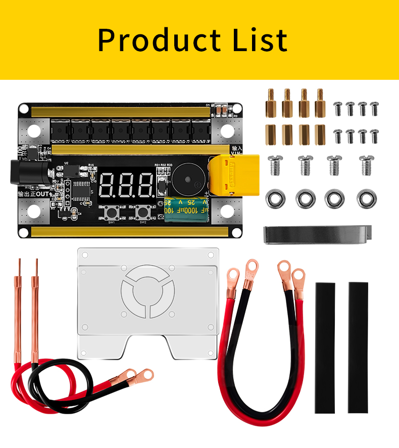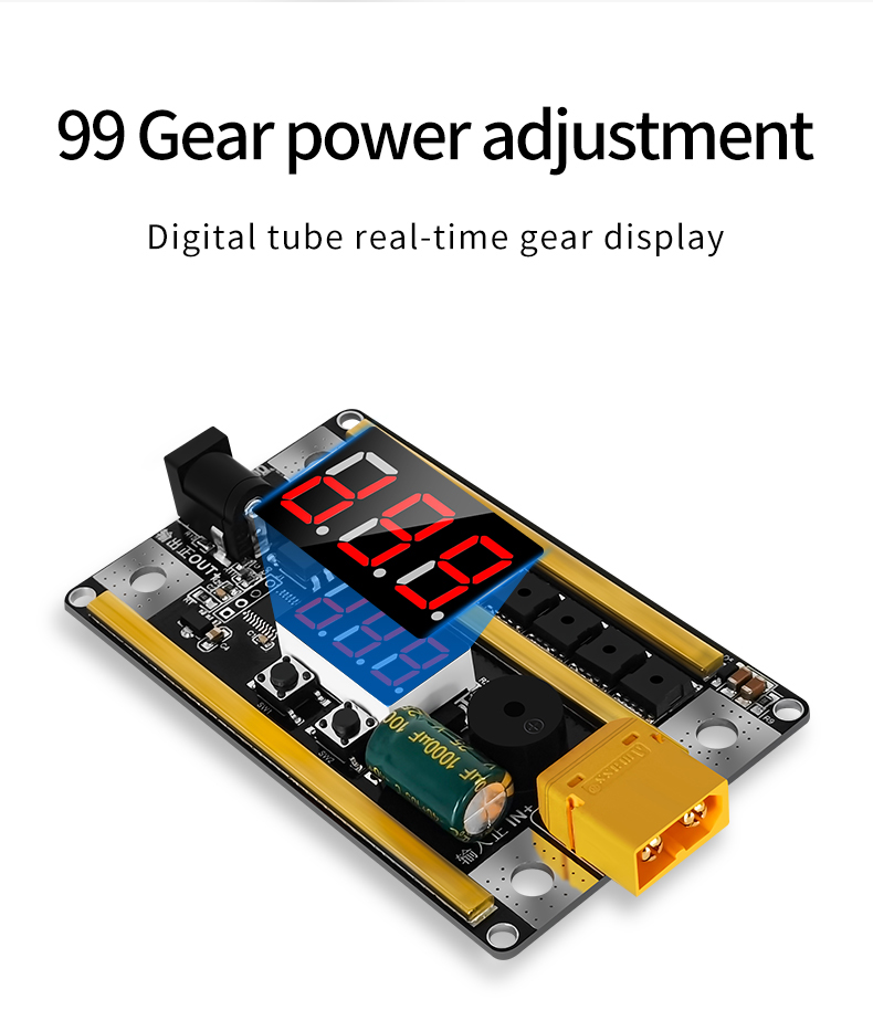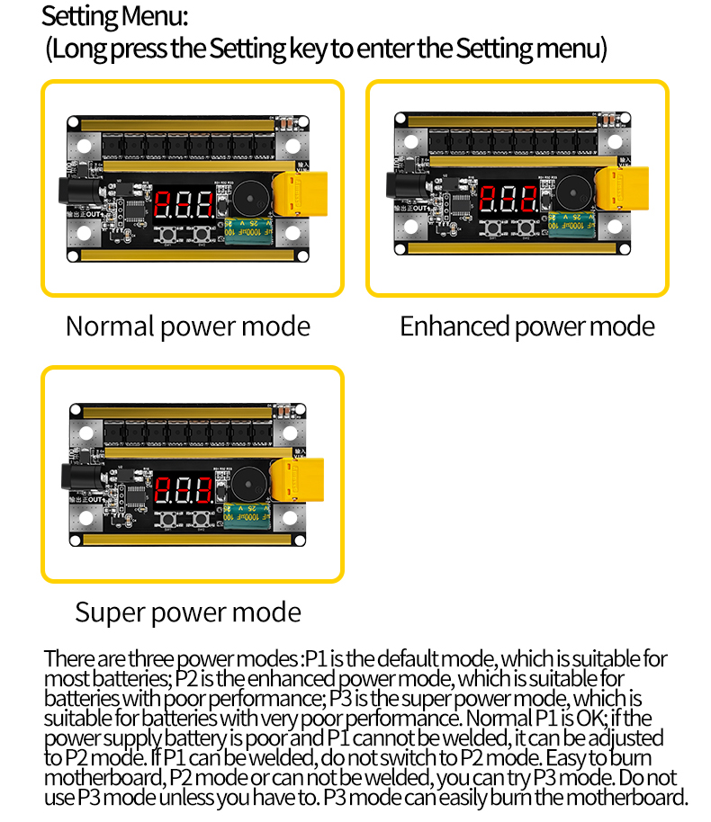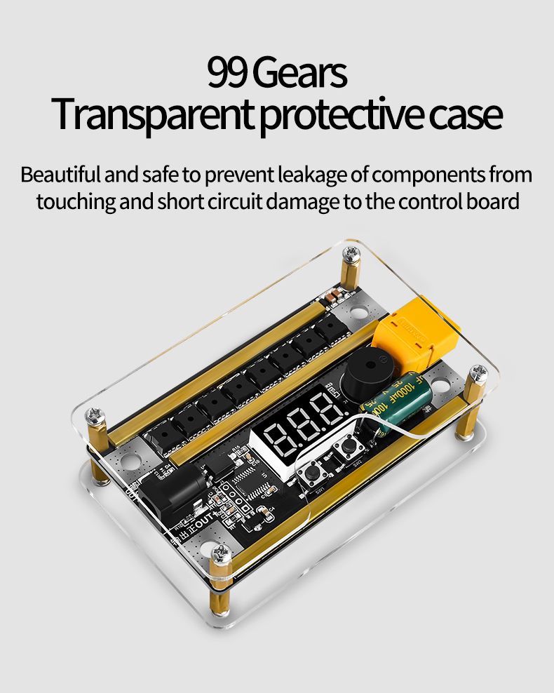 This control board of spots welding machine is high power output design, 99 gears of output power adjustable, more accurate welding, suitable for continuously welding thousands of points on nickel/nickel-plate sheet. With the 3 bit digital-tube real-time gear display function, which not only can display the current gear, but also can detects the battery voltage. Three working modes design, you can switch between general power mode, strengthen power mode and superstrong power mode. It supports 0.1-0.2mm nickel welding sheets and the welding points are more solid and beautiful.