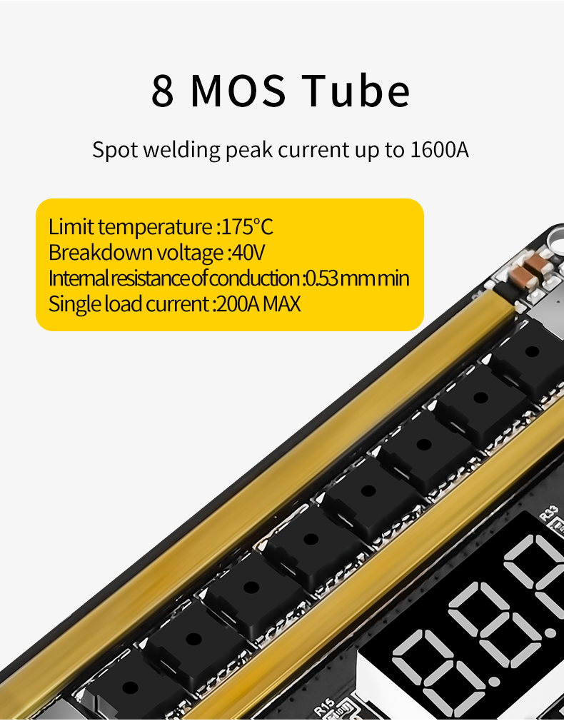 3. Adopts 8pcs MOS tubes, the peaks current is up to 2400A, support 0.1-0.2mm nickel welding sheets and the welding points are more solid and beautiful.