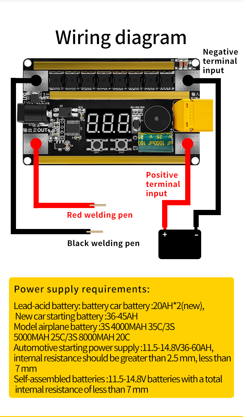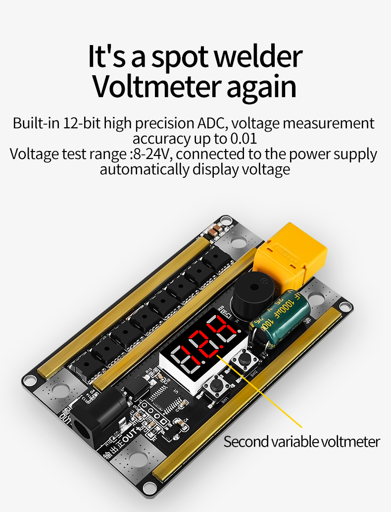 9. It is both spots-welder and voltmeter, built-in 12-bit high-precise ADC, the voltage measurement accuracy is up to 0.01 voltage, with 8-24V test ranges, automatic voltage display when connected to the power supplys.