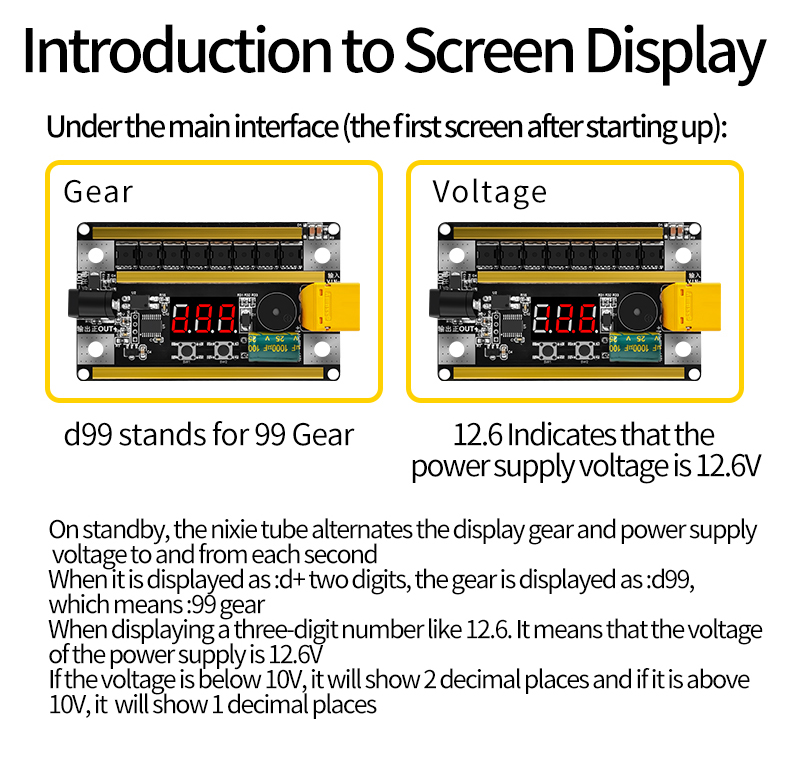 6. When in standby, the digital tube will alternately display the gear and the supplying voltage once every second. When the display reads: d + two digits, means it is under gear display; when the display reads: three digits, such as 12.6, means that the voltage of the power supplys is: 12.6V voltage.