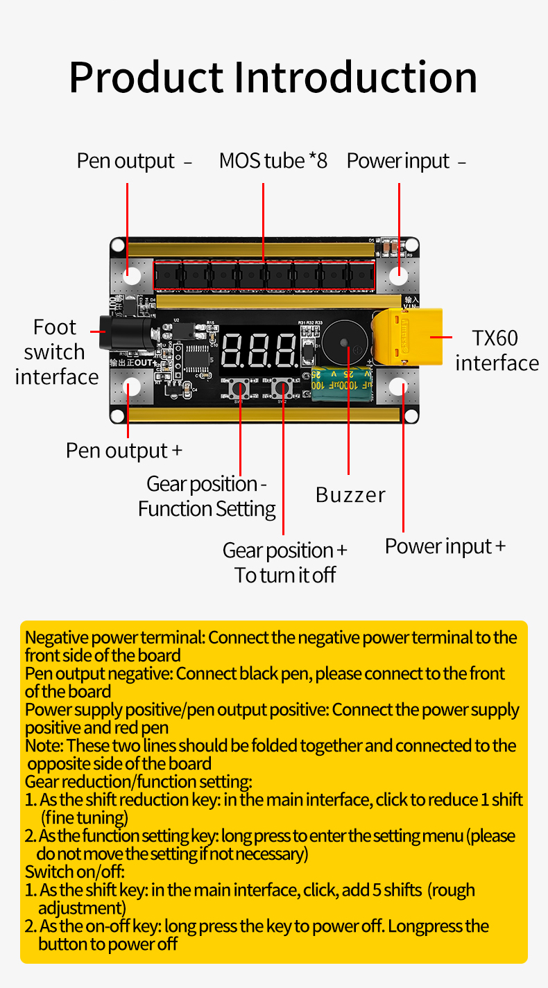 5. With the 3 bit digital-tube real-time gear display function, which not only can display the current gear, but also can detects the battery voltage, and enhances the pleasure of the spots welding.