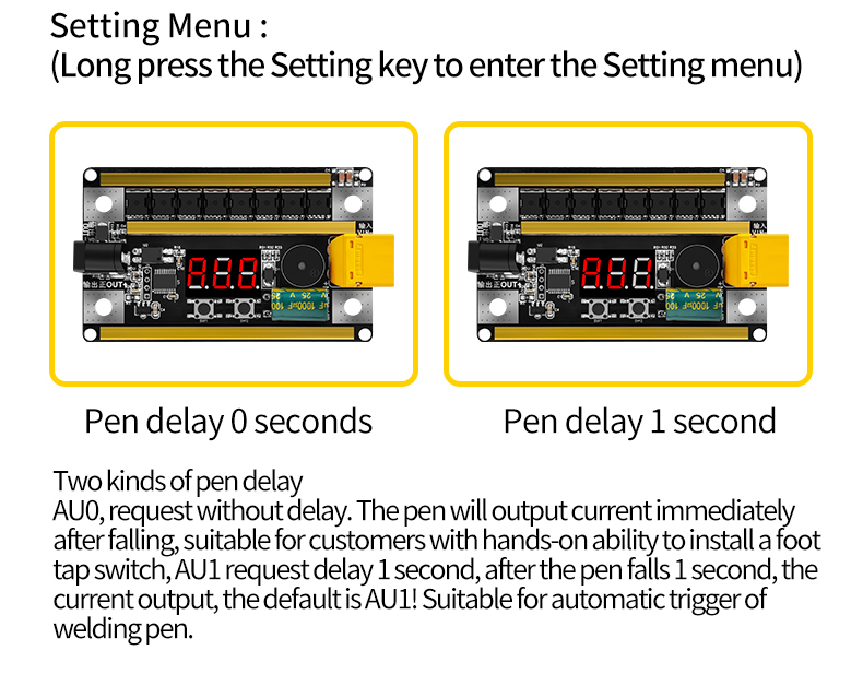 8. Two spots welding delay times are adjustable design, you can set 0s or 1s delay time according to the working demands.