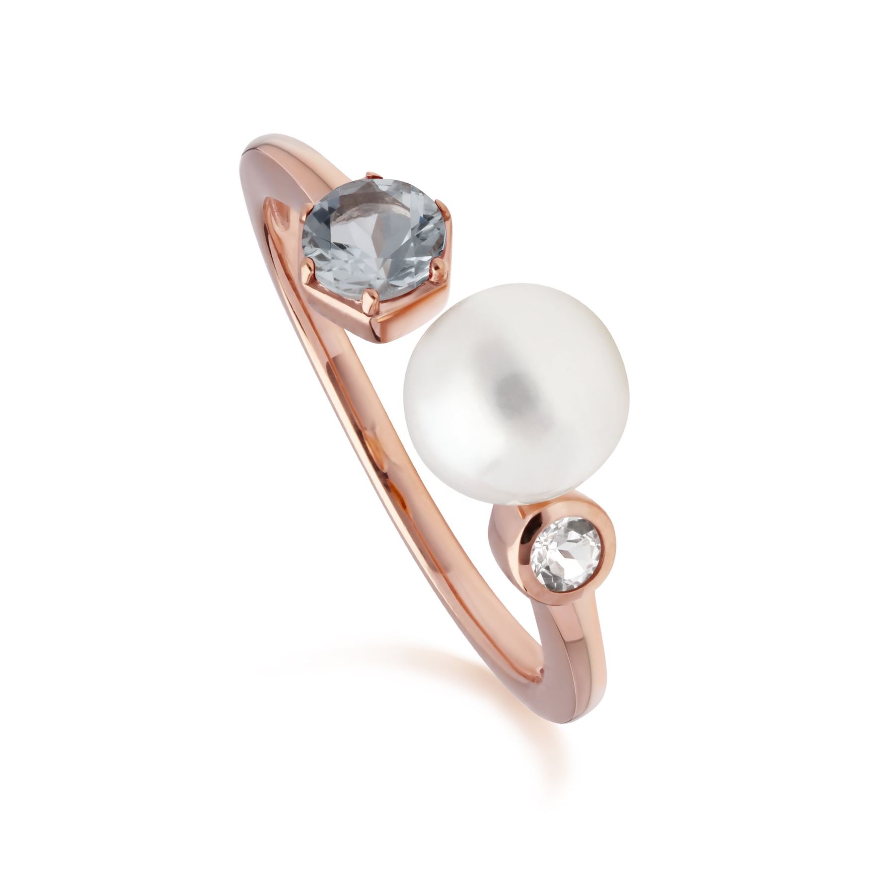 An elegant and contemporary rose gold plated open ring featuring a round pearl, an aquamarine and sparkling white topaz.