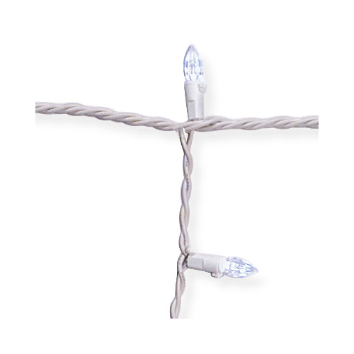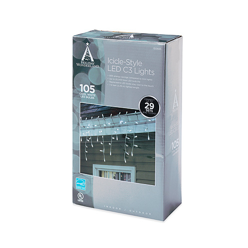 "Holiday Wonderland, 105 Count, LED C3 Cool White Icicle Light Set. 18"" lead, 5"" between bulbs on drop, 3"" bulb spacing, 3"" end, White Wire. 19 strands, Configured (7x4x6x7x4x6x7x4x5..)Color Box. UL Listed."