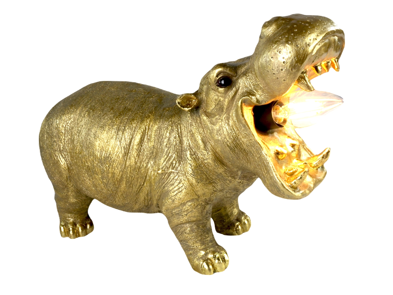 Quirky Hippo table lamp with Open Mouth. Nicely cast in polystone in a painted gold finish. This quirky piece will add a decorative and practical addition to any