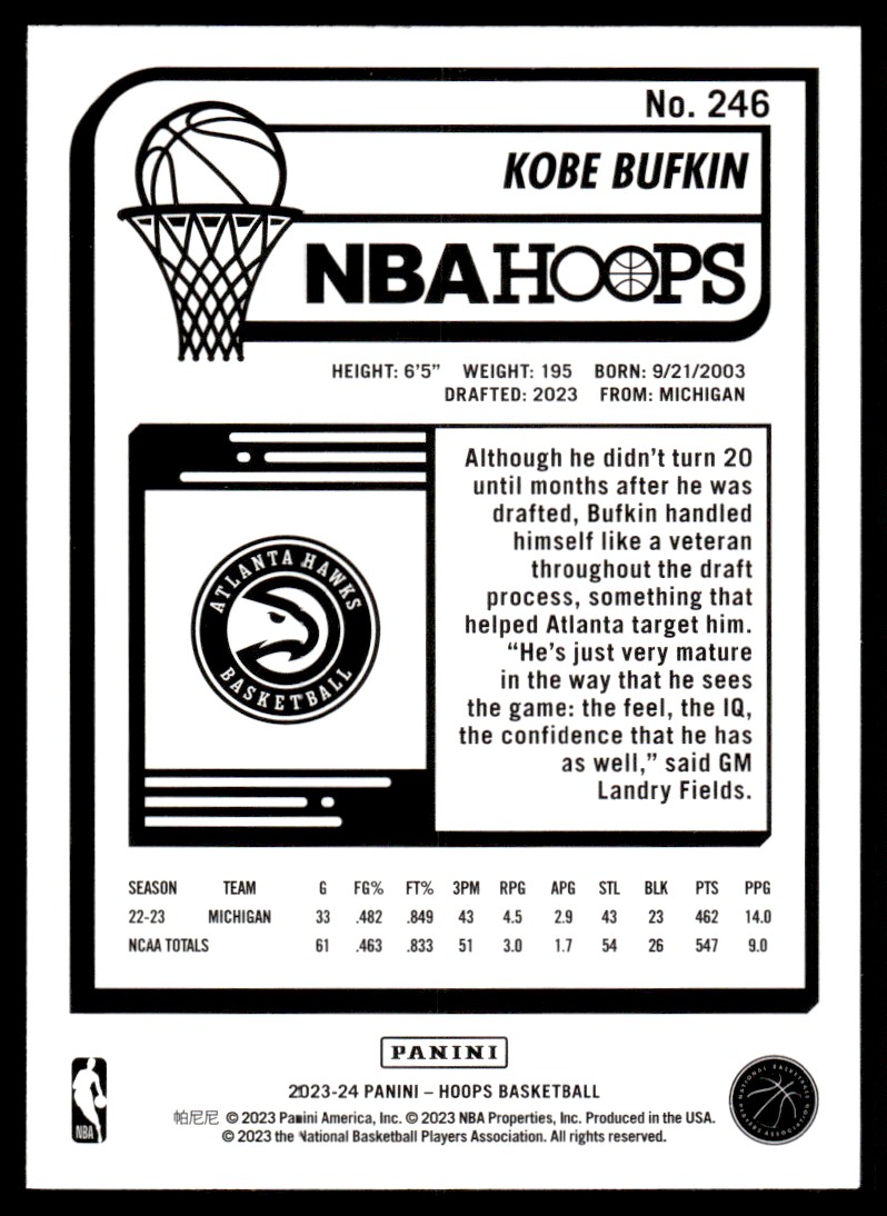 | Kobe Bufkin Rookie 2023-24 Hoops #246 Atlanta Hawks |
