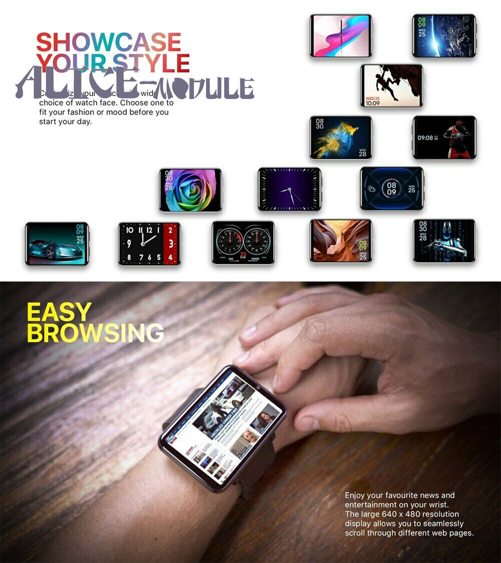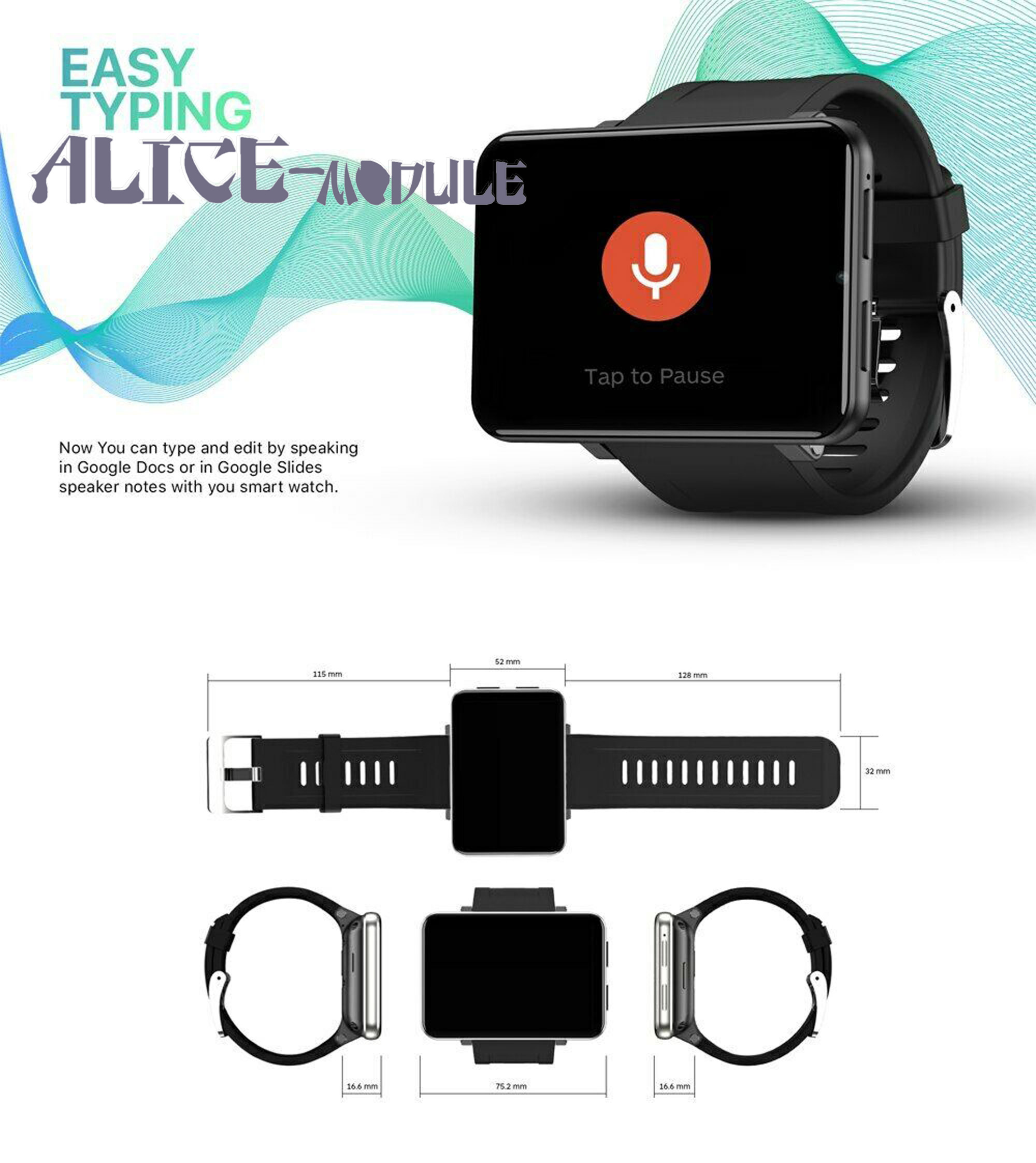 DM100 4G Smartwatch integrates with Pedometer, Heart Rate Tracker, Message Reminder, Interactive Music, Calendar, Dial Call, Push Message, Alarm Clock, Answer Call, Date & Time, Camera, Sound Recorder and Browser. Android 7.1, MTK6739 Quad-core CPU, 1GB RAM+16GB ROM/3GB RAM+32GB ROM Optional, BT & WiFi supported, meet all your needs. This smartwatch will bring you much fun and convenience.