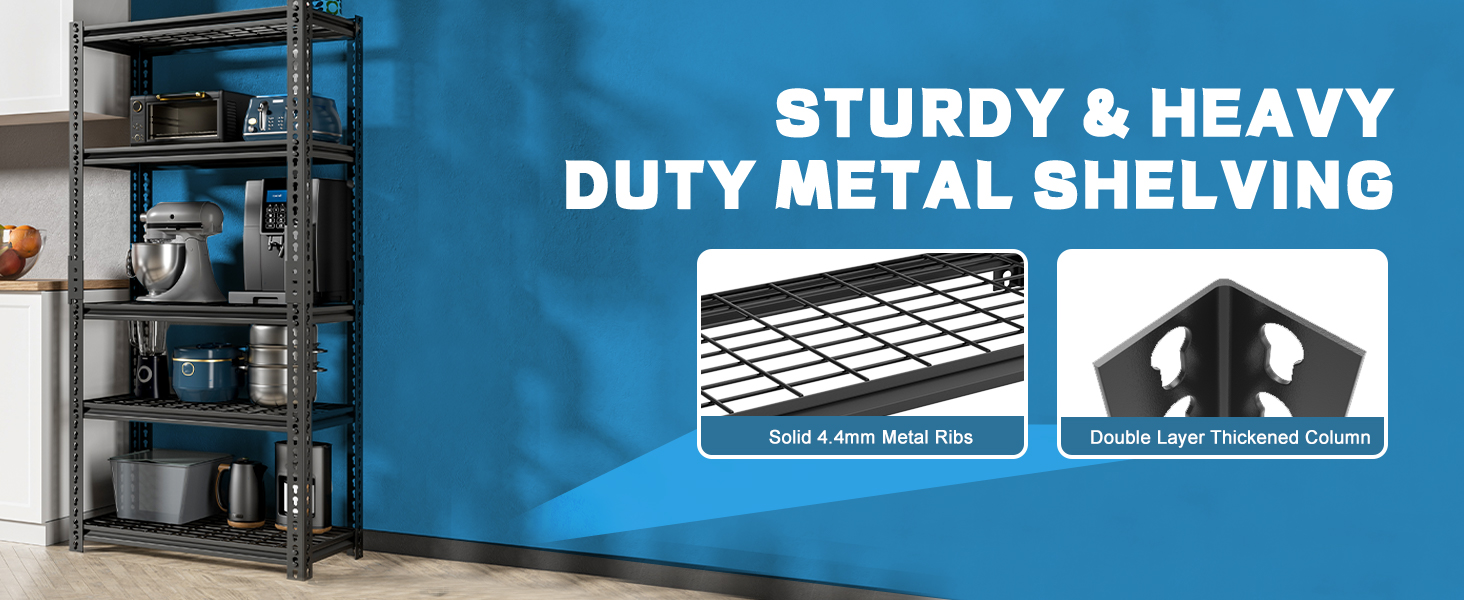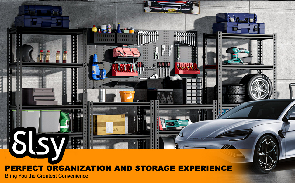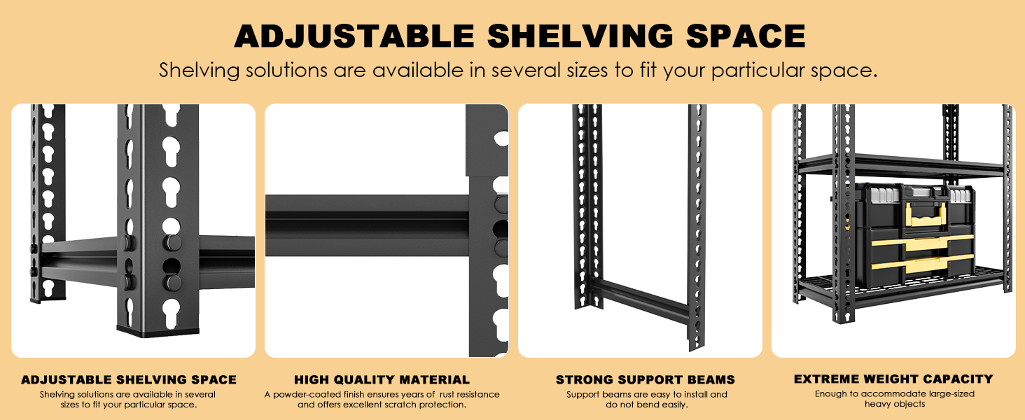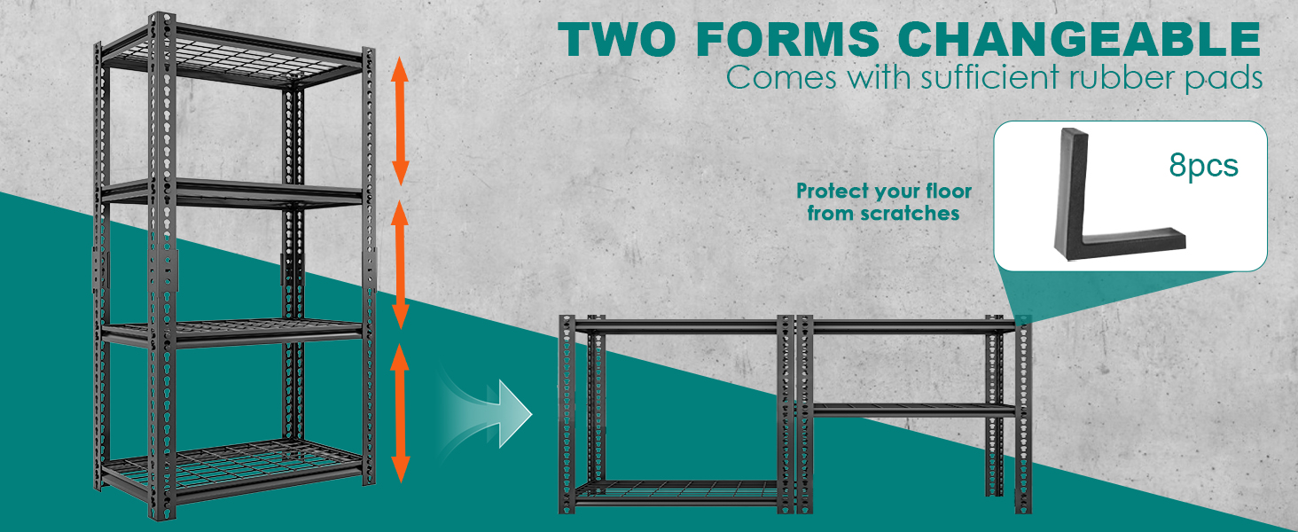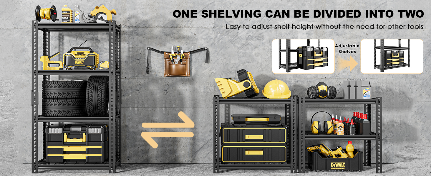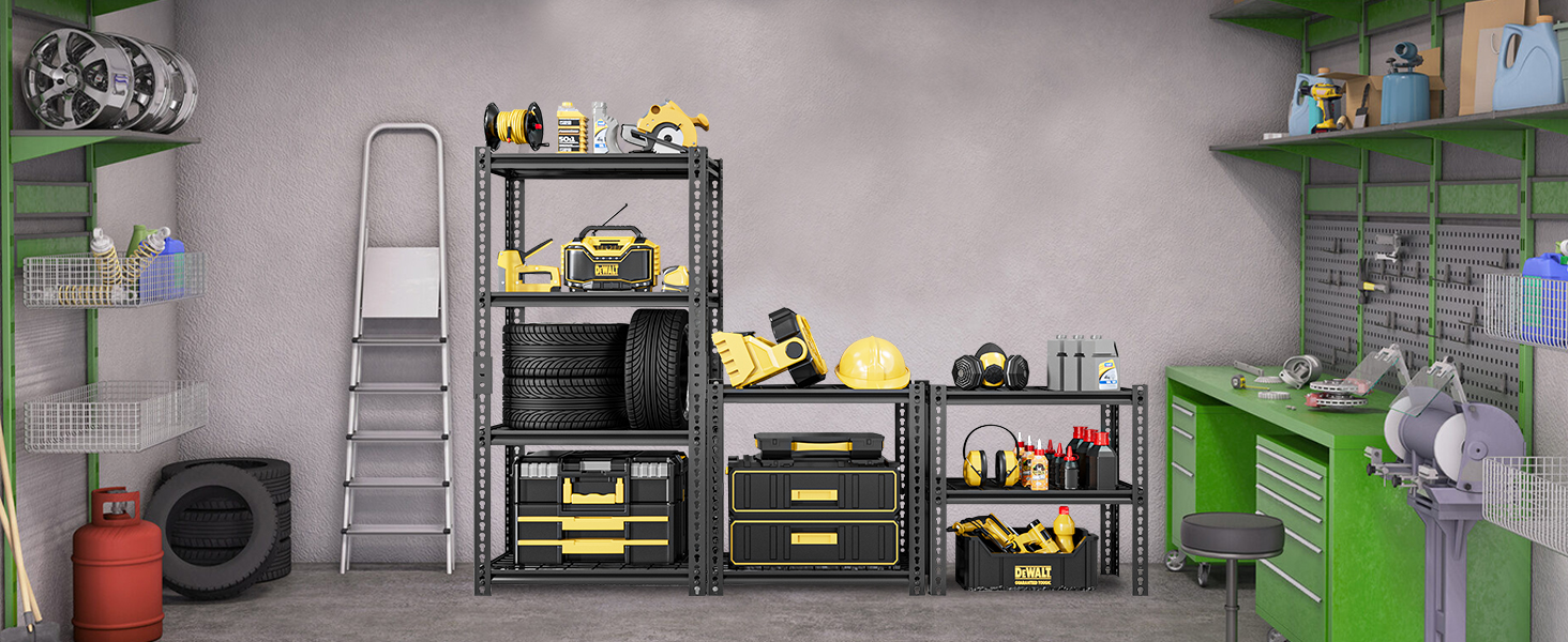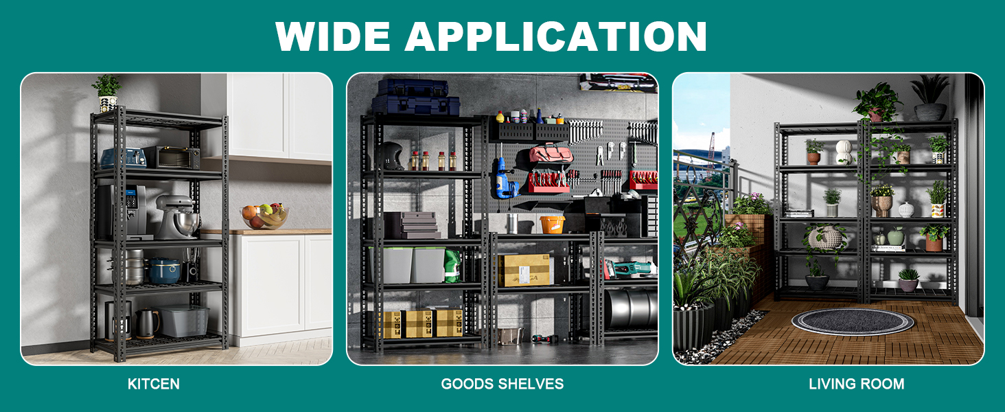 【Wide Application】The heavy duty Garage shelving is versatile for garage, kitchen, warehouse, living room, bedroom, basement, workplace, etc. The 4-tier / 5-tier adjustable garage shelving not only enlarge your storage space but also keep your space neat.