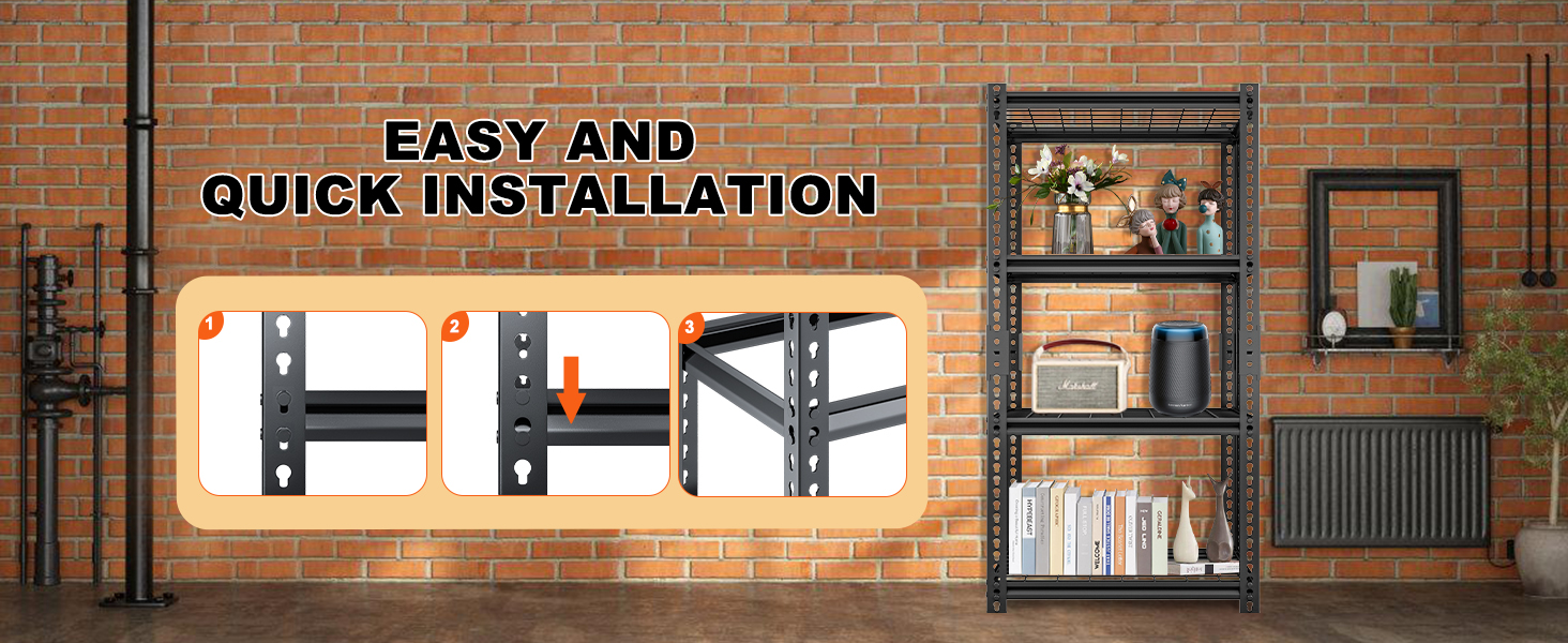 【10 Minutes Easy Assembly】 The heavy duty shelving adopt a hanging hole design, which can really realize a 10 minute fast installation without screws and nuts. Please refer to the video or manual for installation. If you need tools, it is recommended to install them with a rubber hammer. (Rubber hammer is not included in the package)