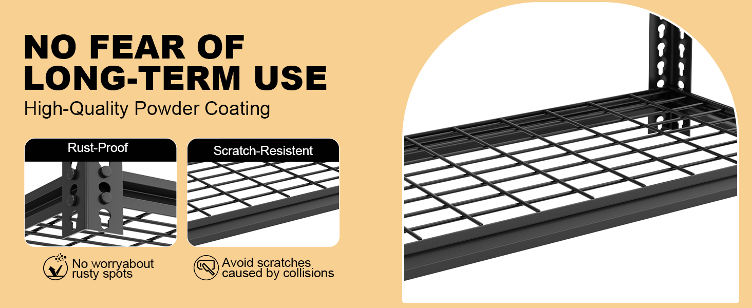 【Rust-Proof & No-Scratches】The entire all-metal shelving uses an anti-rust painting tech, easy to clean, moisture-proof and rust-proof.Foot pads are included, which protects your floor from scratches. This garage storage shelves is best gift for men or your family