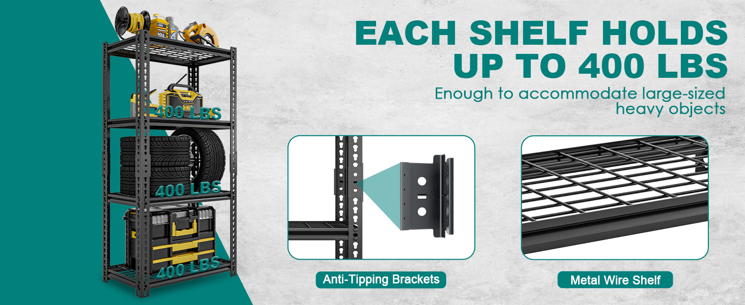【1600LBS Capacity & Extremely Sturdy】 This garage shelving heavy duty has thickened legs, which was made of high-quality metal. Each thickened solid metal shelf, with additional stiffener instead of flimsy wood board can hold up to 400 lbs, a total of 1600LBS bearing capacity gives you perfect storage experience. No matter how much weight you put on it, the garage storage shelves heavy duty will not shake or wobble.