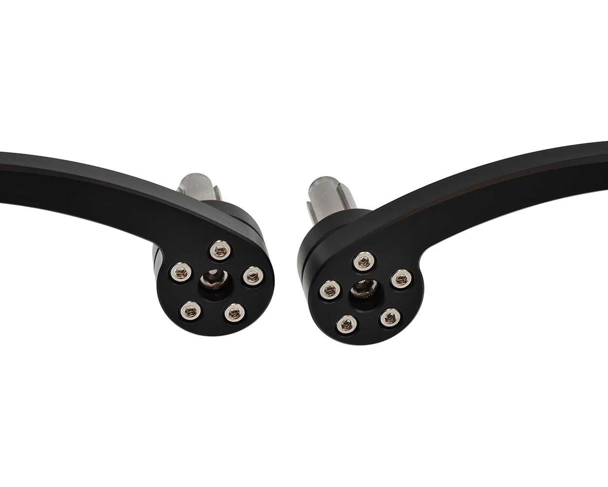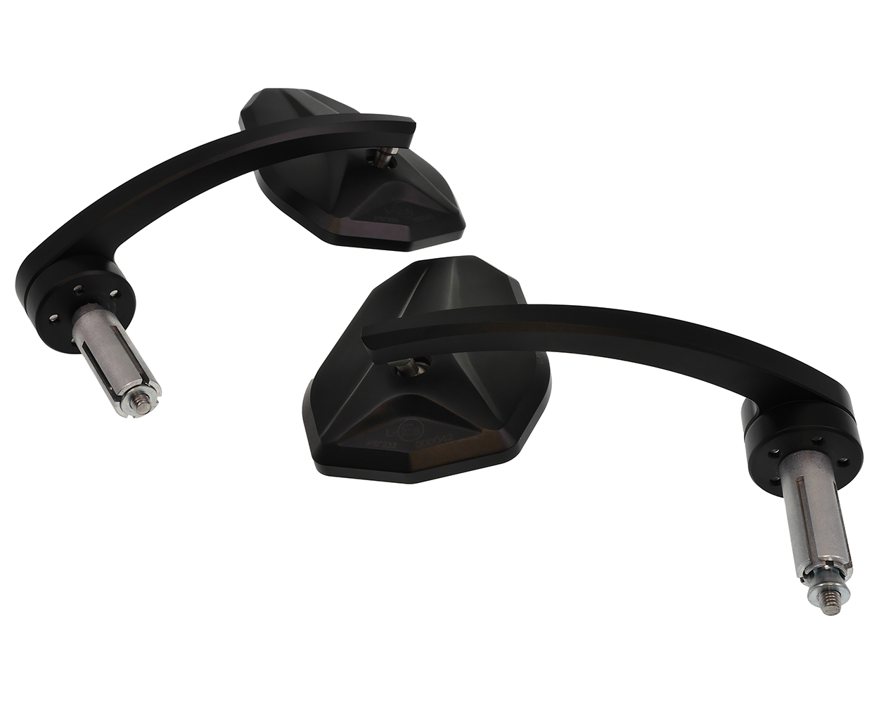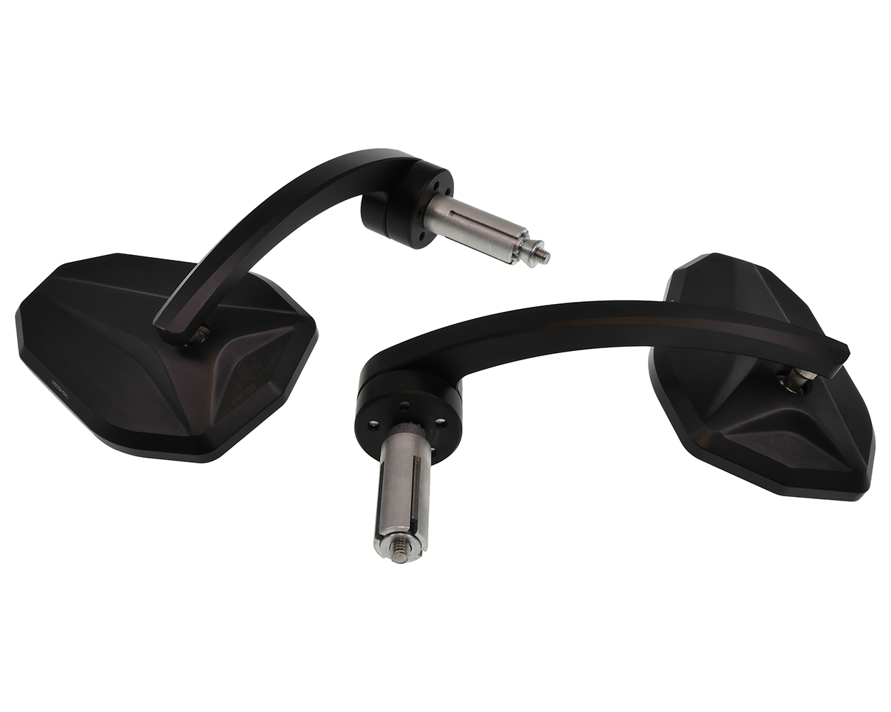 Edles Lenkerendenspiegel Set von HIGHSIDER aus schwarz eloxiertem Aluminium mit gebogenem Stiel. Die EVO Versionen haben eine neue Stielform und werden mit einem Anbauset geliefert. Die Spiegel passen für Lenker mit einem Lenkerinnendurchmesser von 12 bis 22mm, das heißt für die meisten 7/8 Zoll und 1 Zoll Alu- oder Stahllenker. Die Spiegel können rechts und links verwendet werden. Durch die vorhandene E-Nummer können die Spiegel legal im öffentlichen Straßenverkehr verwendet werden.