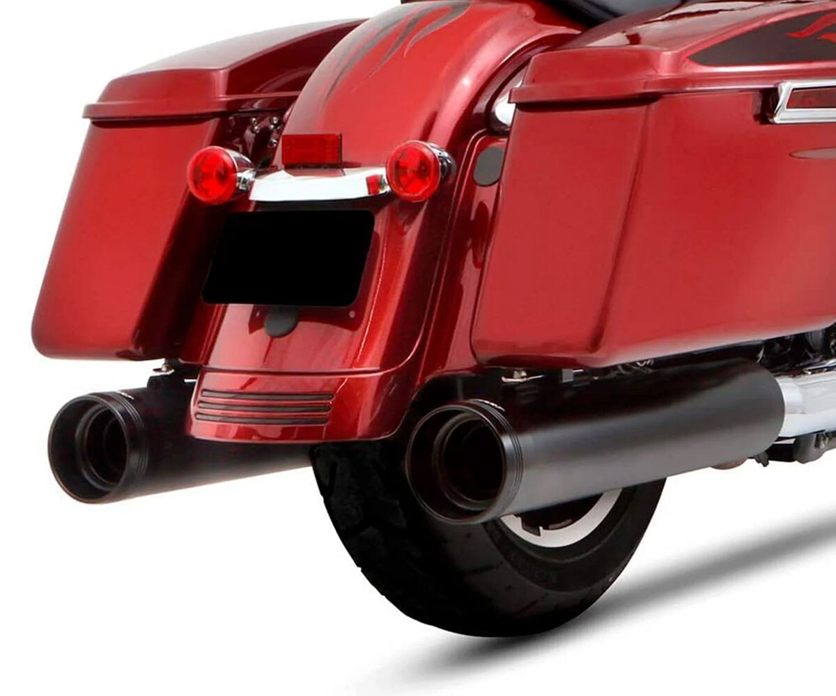 | Finished off with our popular famous end caps, this muffler has a look that is as big as its sound, and perfectly complements the style of the Harley Bagger. |