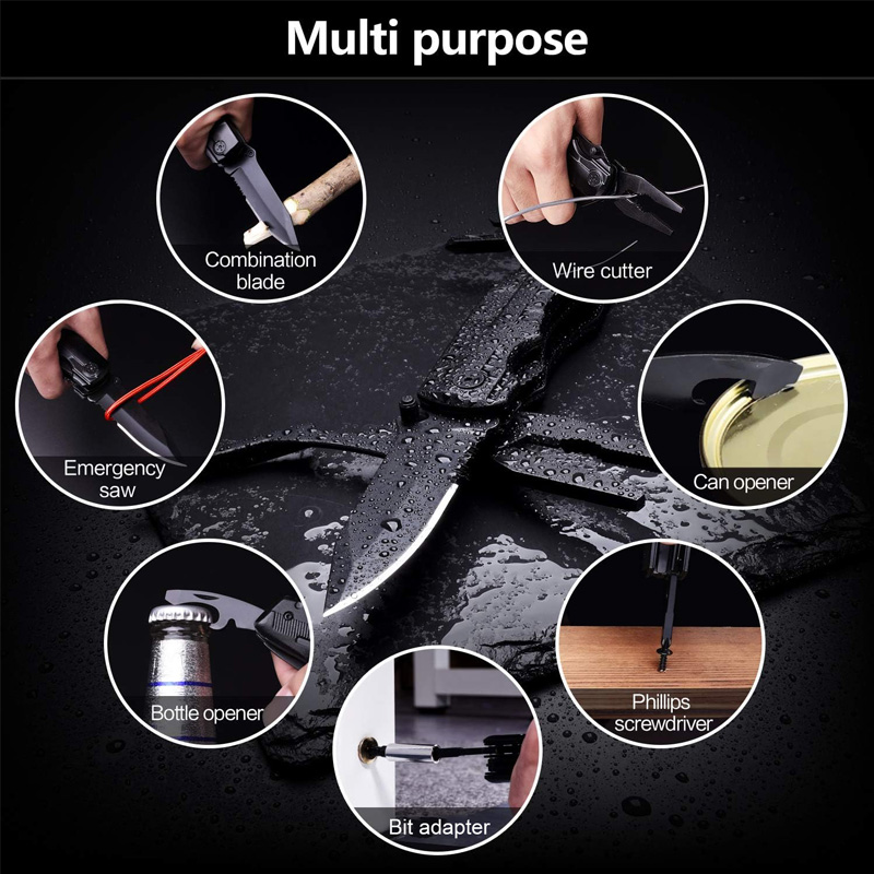 【PRACTICAL】- Tactical knife, needle-nose pliers, regular pliers, wire cutter, can opener, opener, phillips screwdriver, slotted screwdriver and 10-in-1 screwdriver bit kit guarantees a multi-purpose using. It’s well built with stainless steel and coated with black oxidation. Perfect for hunting, work, travel, car, backpacking, hiking, outdoor activities, and home improvements