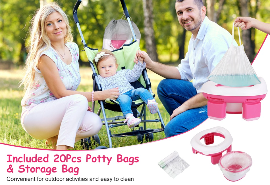 - Travel-Friendly Potty Training Toilet:Children have difficulty in controlling urgent potty demands during outdoor activities. Our travel-friendly potty toilet is your perfect solution to solve this awkward and anxious situation on the go. Package includes 1 roll of disposable potty bags(20Pcs),eliminating the trouble of cleaning this portable toddler toilet while lack of water.