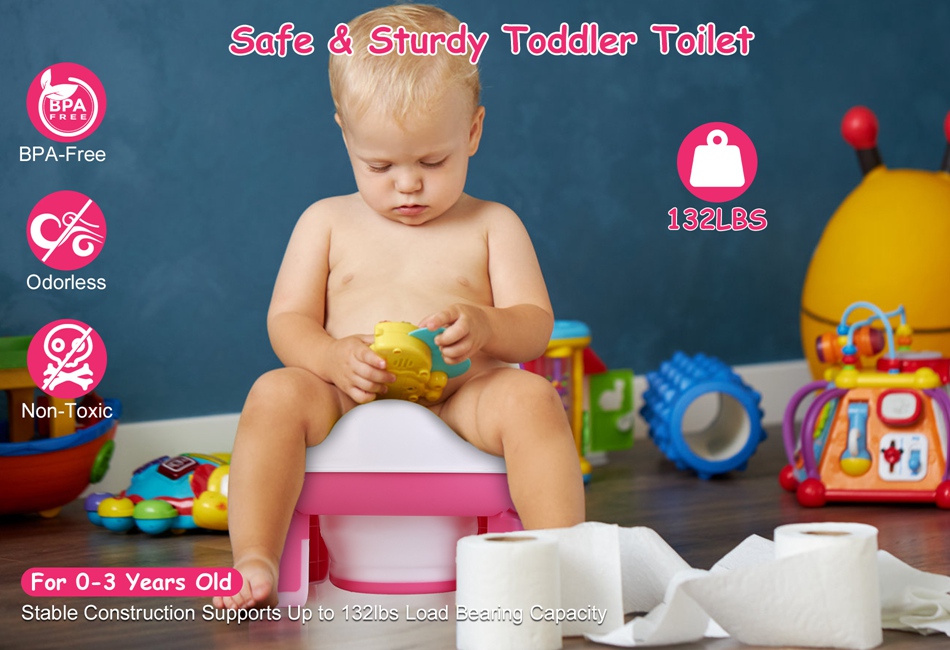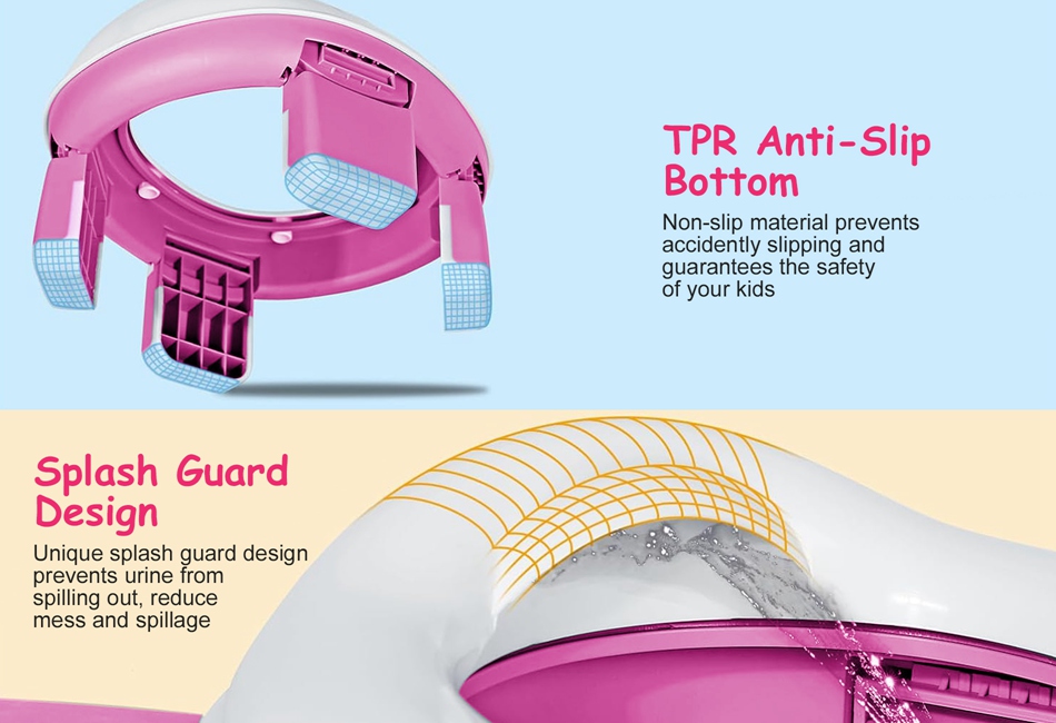- Safe & Sturdy Material:Made of BPA-free, PP material and certified by CPC,this potty seat guarantees the safety of your kids. Featured with TPR anti-slip material on the bottom of legs to prevent accidently slipping and splash guard to prevent urine from spilling out,our toddler potty toilet is definitely reliable and thoughtful.