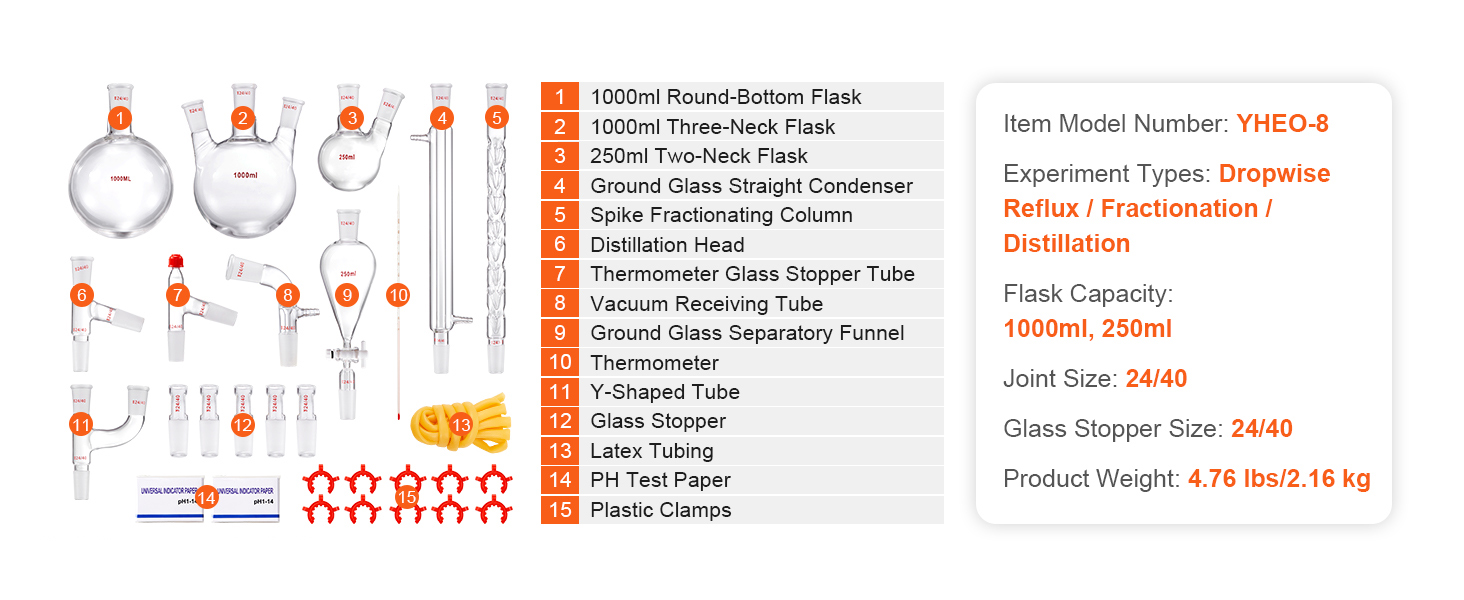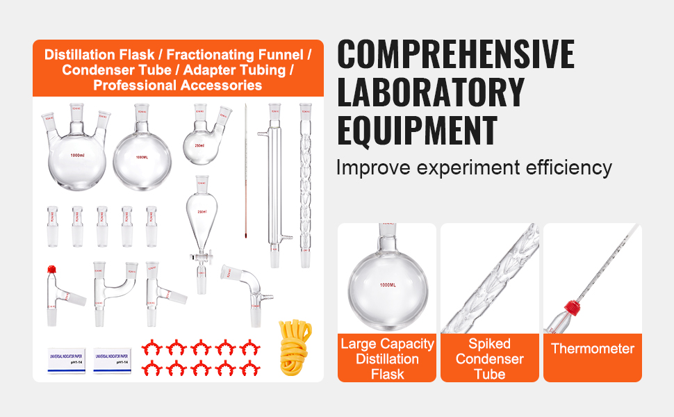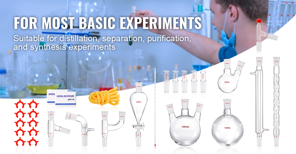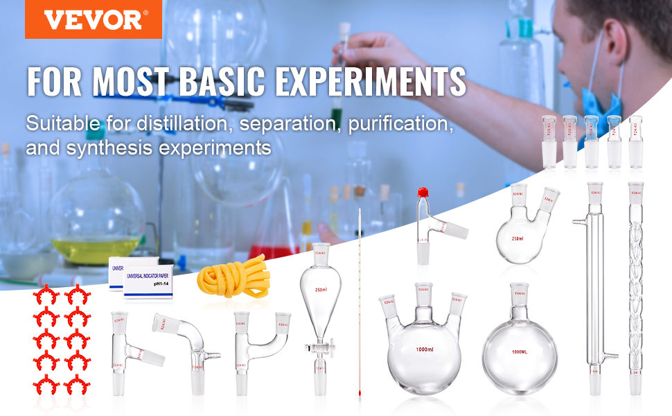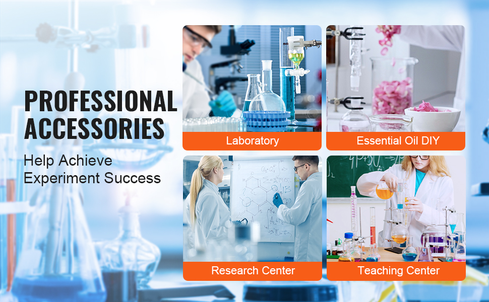 Versatile Applications: VEVOR's professional distillation kit covers nearly all essential tools for laboratories, homes, research centers, and educational settings. Ideal for collecting essential oils, aqueous extracts, and distilled water.