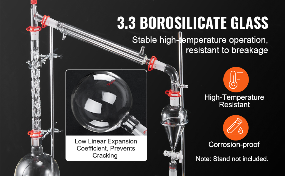 Elevate your essential oil extraction with VEVOR's distillation apparatus. Crafted from durable 3.3 borosilicate glass, it ensures lasting durability and reliability. It also features high temperature and corrosion resistance, ensuring efficient experiments and confident results!