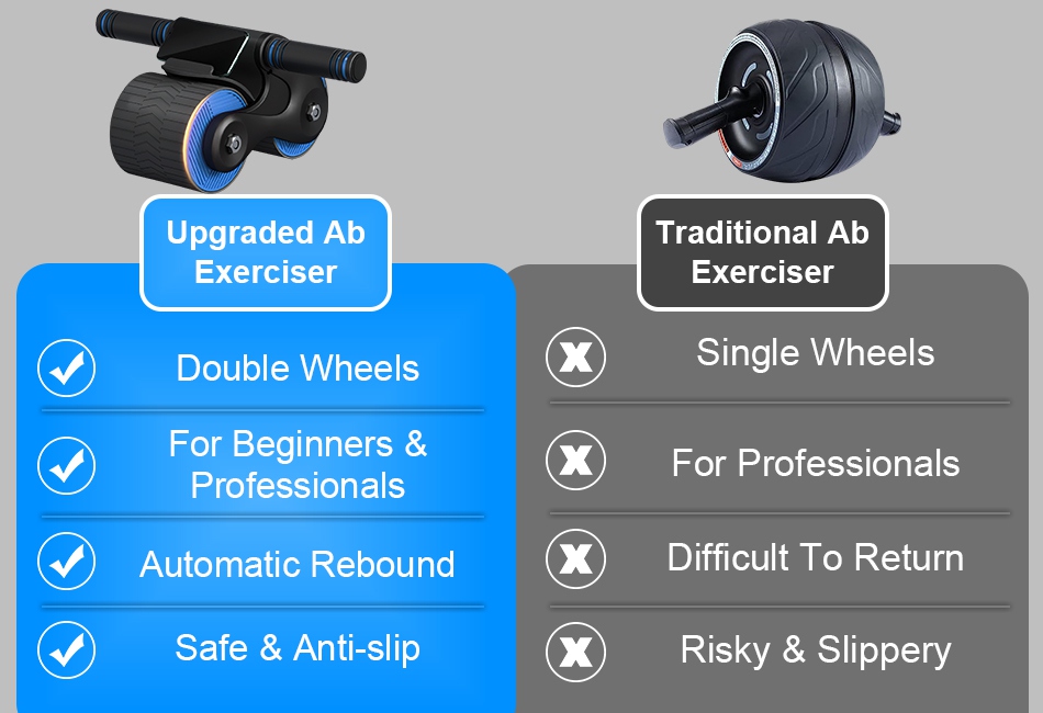 - Automatic Rebound Abdominal Wheel:Designed with ergonomic double wheels,our automatic rebound ab machine can protect you from getting injured during exercise. The anti-slip wheels can hold up to 440.9lbs load,ensuring much stability and creating a safer fitness experience.