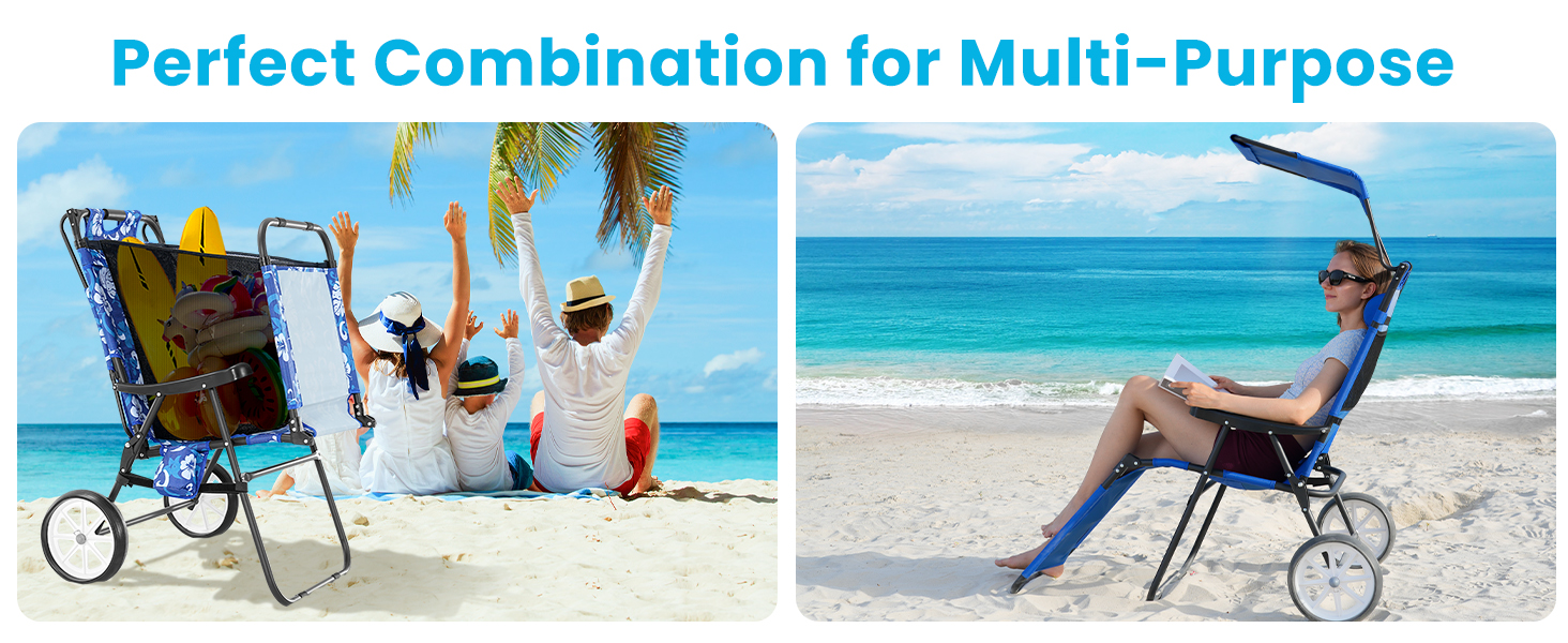 VERSATILE 2-IN-1 DESIGN - Discover the ultimate in beach comfort and convenience with our 2-in-1 Lounge Chair and Wagon. Effortlessly switch between a comfortable lounge chair and a practical beach cart, perfect for transporting all your essentials across sand or grass
