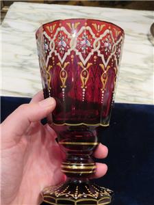 The Following Item we are Offering is A Magnificent Rare 19th Century Moser Goblet. Moser Cranberry Red Glass Goblet has geometric design in white and gold paint. The Flowers are surrounded by intertwining lines of colorful flowers and leaves. Originally Priced at $1500. Comes with Certified Appraisals!!!