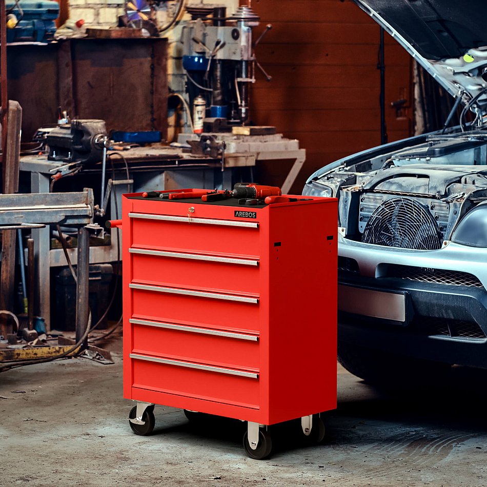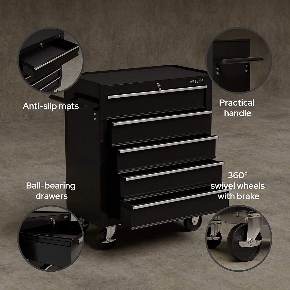 [PERFECTAMENTE EQUIPADO] Nuestro carro de herramientas AREBOS está equipado con un total de 5 cajones | Fabricado en acero macizo | Encimera robusta y resistente a los arañazos | Los cajones con correderas de bolas y alfombrillas antideslizantes garantizan que las herramientas permanezcan en su sitio y se evite el traqueteo al mover el carro.