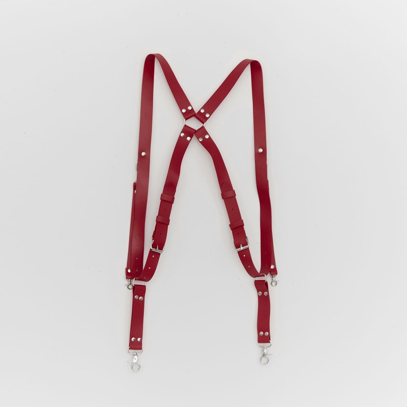 Men y-back PU leather suspenders with four metal clips, adjustable buckles and rivets.