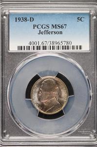 Up for auction is a 1938 D Jefferson Nickel. This coin is uncirculated and is graded MS67 by PCGS. The coin pictured is the one that you will receive. Sorry, but no international shipping. Each additional item ships for $1.00 if paid for in the same payment. Your order will be shipped within 1 day of payment. Thanks for looking and make sure to check out my other listings.