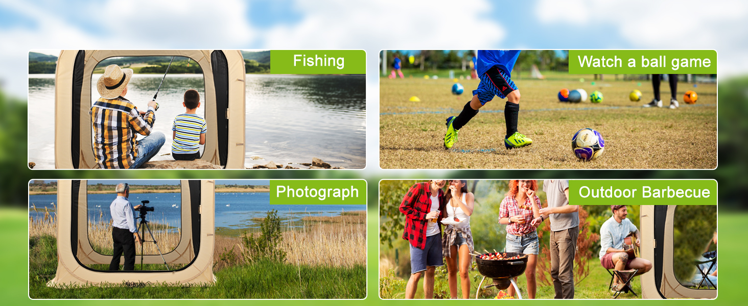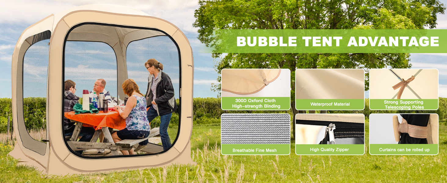 Camping tent made from Mesh, offers a 540°ultra clear view of your surroundings. Ideal for outdoor games such as soccer, baseball, softball, field hockey, and a variety outdoor activities such as fishing, camping, BBQ. The fully transparent roof is perfect for stargazing at night. All weather shelter rain tent for Soccer, Football, and Other Outdoor Events. The small tent measures length (51") x width (51") x height (71"), can provide you with a spacious and comfortable shelter for 2-3 person. The large tent measures length (71") x width (71") x height (71") fit for 4-6 adults. The pop-up bubble tent is portable and can be set up by a single person in about one minute. An automatic pop-up, no assembly needed tent perfect for setting boundaries between you and others out in public or in the privacy of your own space. The tent can be easily folded down and fit into the carry bag with a compact size.