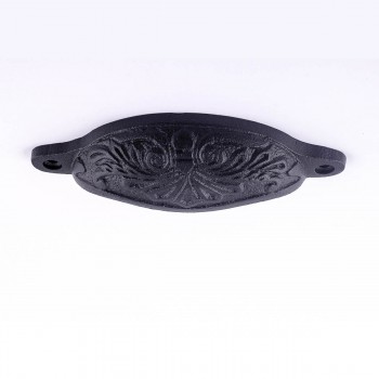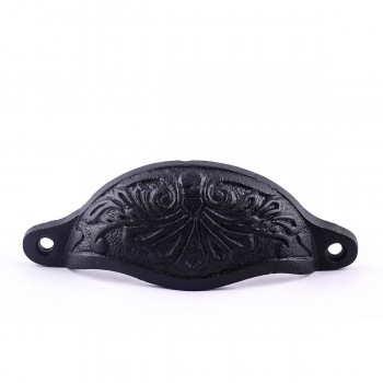 Our floral, fan and fern designed handcrafted wrought Iron hardware pulls will impart an old colonial charm to all of your home office improvement furniture. Add some vintage character to your kitchen cabinet, wardrobe, chest, dresser, vanity, window sashes, cupboard, closet doors or sideboard and bookcases with our unique black floral cup pull handles. Wrought iron bin pulls with black powder coating stays intact for many years.