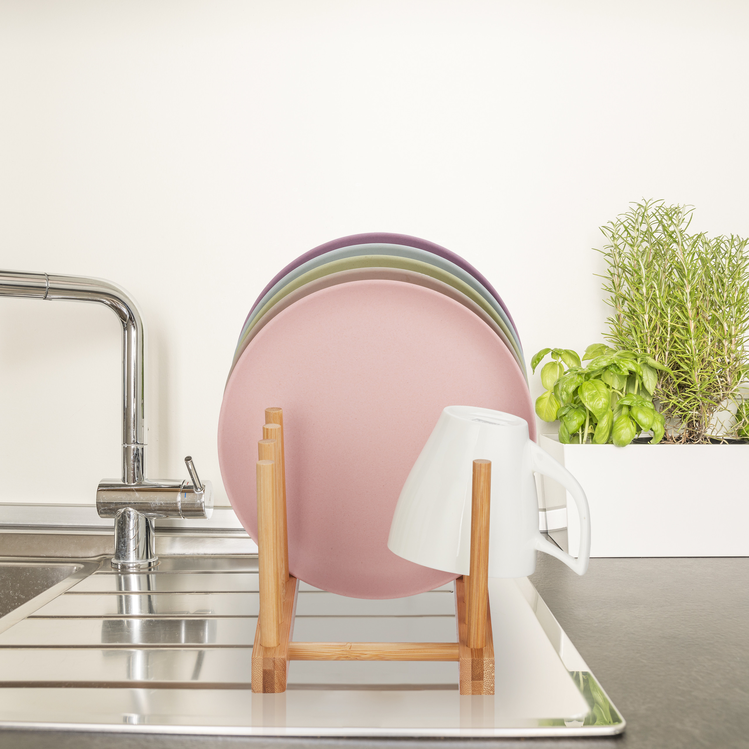 In einem Singlehaushalt lohnt sich meistens die Anschaffung eines Geschirrspülers nicht. Einfach den Abwasch schnell per Hand erledigen und das Geschirr auf der natürlichen Geschirrablage aus Bambus in Ruhe trocknen lassen. Überdies ist der Geschirrabtropfer ein echtes Multitalent. Im Schrank können Sie die Deckel von Pfannen und Töpfen übersichtlich darauf verstauen. Und auf der Küchenablage ist er ein dekorativer Brettchenhalter.