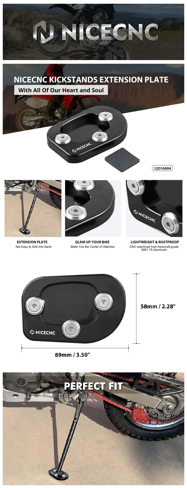NiceCNC's Large Sidestand Foot stabilizes your XR650L, when parked on the side stand. Whether you find yourself parking on grass, gravel, mud or forest soil, the increased surface area of the NiceCNC Sidestand Foot dramatically improves the stability of the XR650L, making your off the beaten path parking much easier.