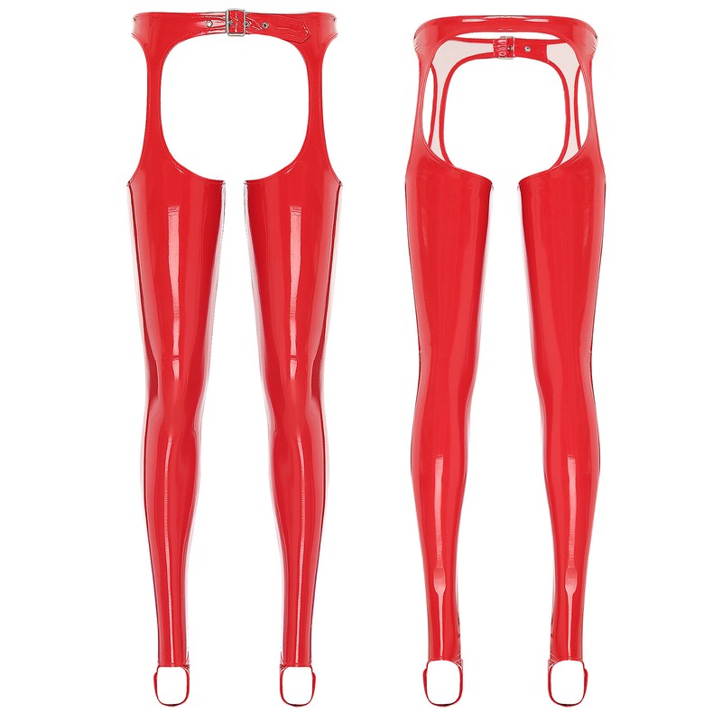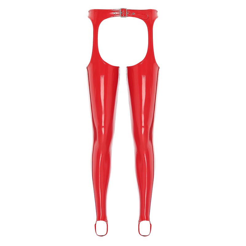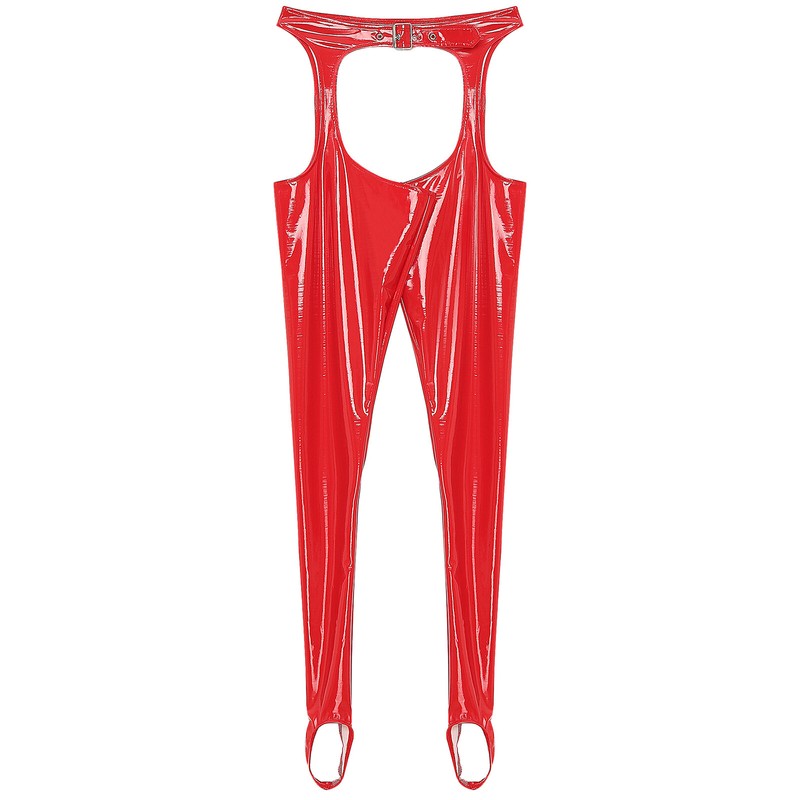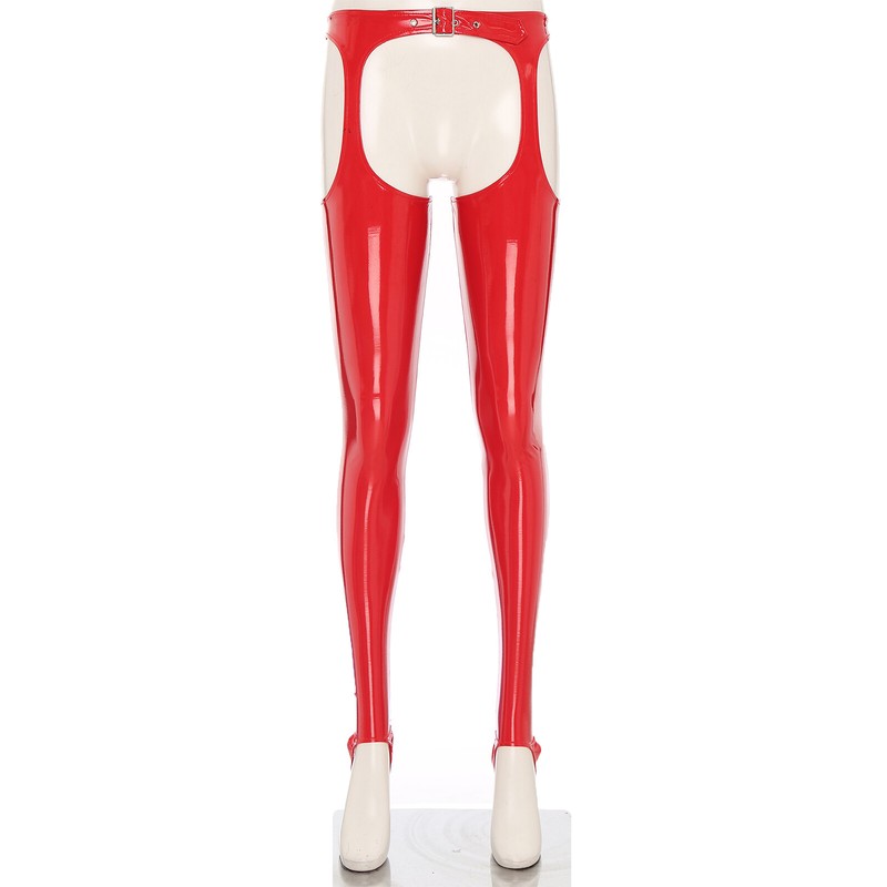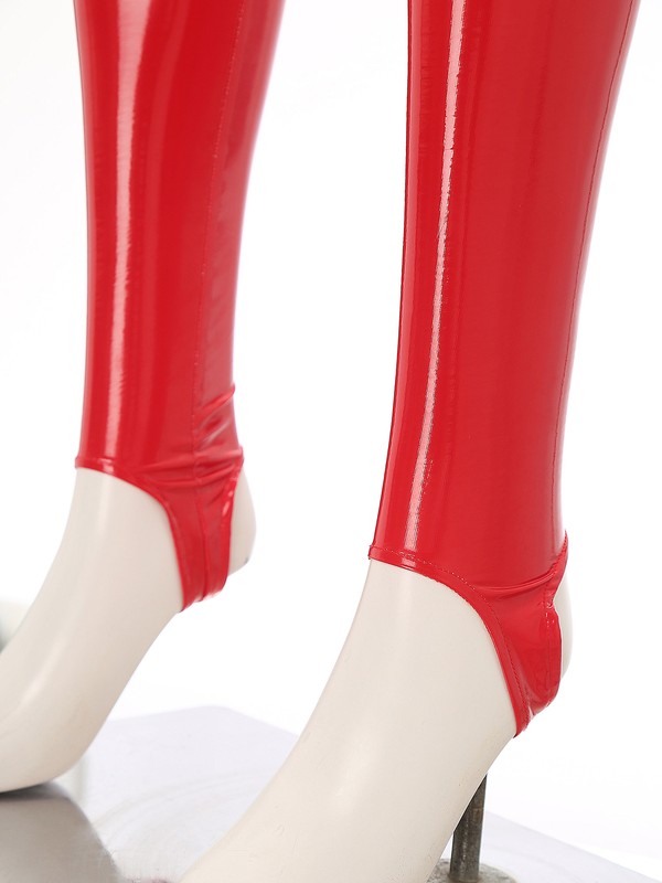 Glossy appearance, two-way zipper at crotch, low waist with belt loop.