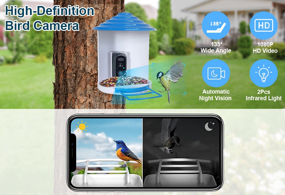 - 1080P HD Video Bird Camera:This bird feeder with camera provides you 135° wide visual angle,allow you enjoy a good view of HD 1080P high-definition image or video quality. Adopt 2Pcs infrared light,the camera has great night vision function,you can clearly monitor the visiting birds at any time during both day and night.