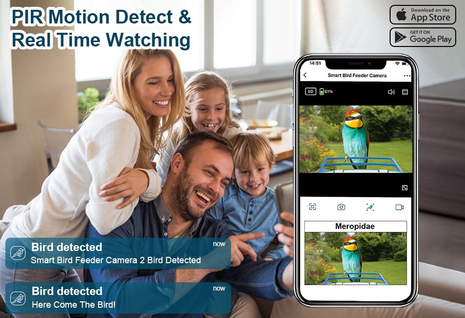 - 11000+Birds AI Identify & PIR Motion Function:Come with PIR motion function,help you receive real-time notifications whenever motion is detected. Built-in microphone and speaker achieve 2-ways audio,you can hear the sounds of the birds or chase the annoyed squirrels and people. What’s more,advanced AI bird identification system(need to pay for it) can recognize over 11,000 bird species,perfect for new bird lovers,make you become a real bird expert.