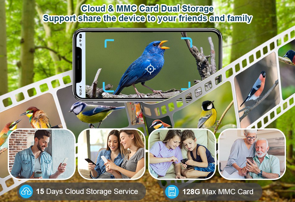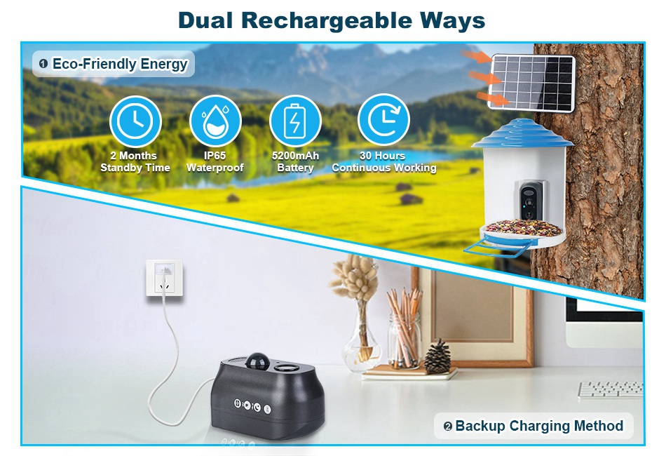 A must-have bird feeder camera for bird lovers! With night vision function, this 1080P WiFi Camera provide you 135° wide visual angle and help you capture video or pictures of beautiful birds during day and night. Adopt PIR motion and AI identify function, you can instantly receive the real-time images, and 11,000 bird species recognition system definitely can help you become a bird expert. Dual power supplies and IP65 waterproof ensure continuous usage in almost all kinds of weather conditions. Built-in microphone and speaker allow you to clearly hear the sound of bird and chase the unwelcome visitors. Besides, this camera supports up to 128G MMC card storage and cloud storage, no need to worry about data losing.