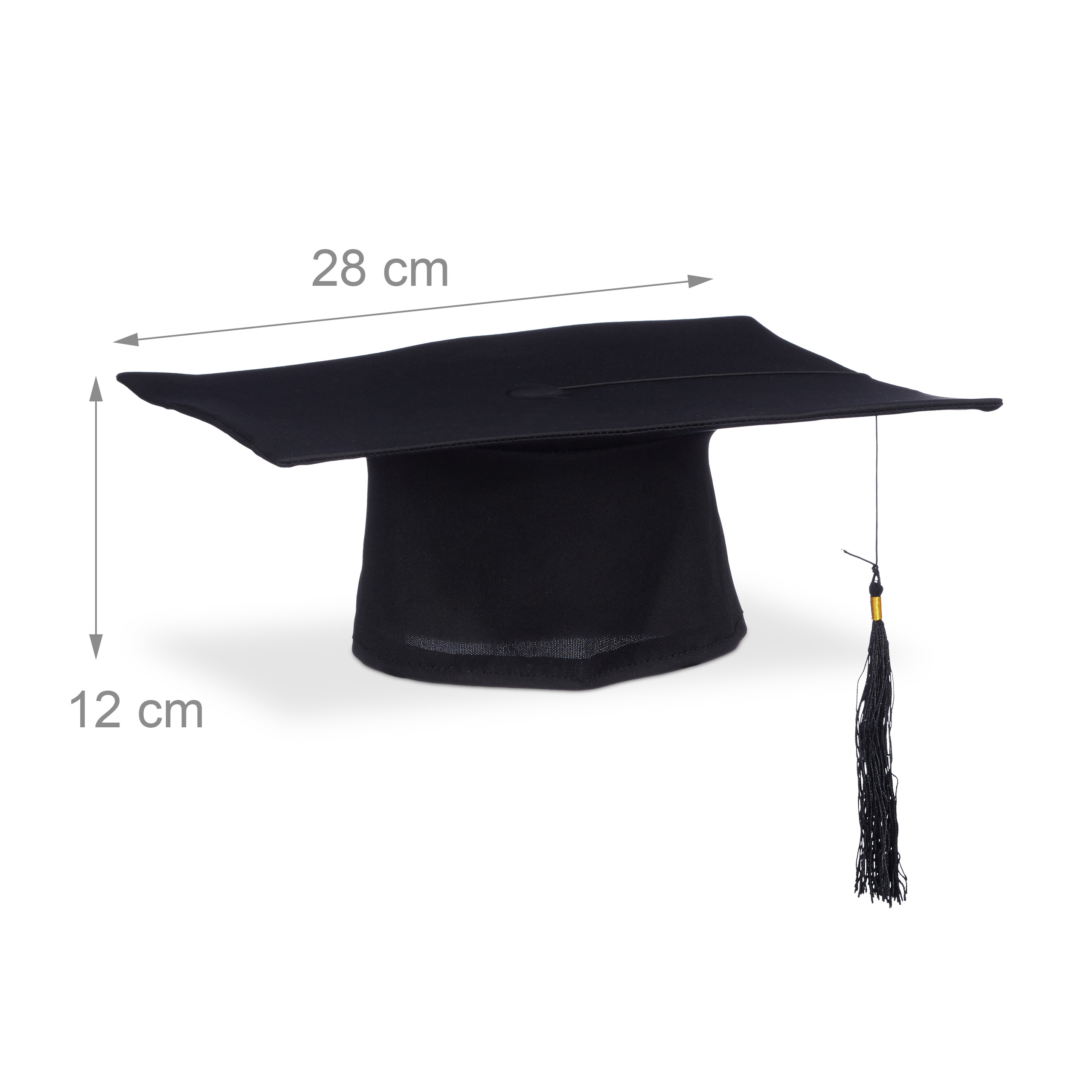 - Birrete de graduación de talla única con goma elástica; mide 12 x 28 x 28 cm (alto x ancho x fondo)