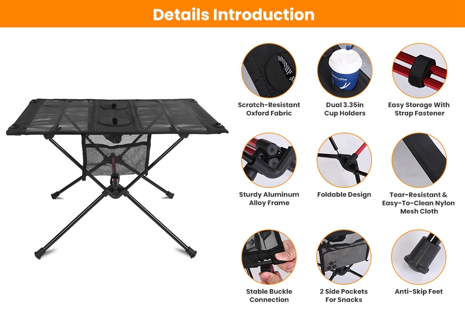 - High Load Capacity:Made of heavy duty aluminum alloy and solid construction,it's able to hold up to 11lbs items,not easy to break down. The table top made from tear-resistant oxford fabric and nylon mesh is breathable and easy to wipe clean. Anti-skip feet make the camping table more stable and safe to use.