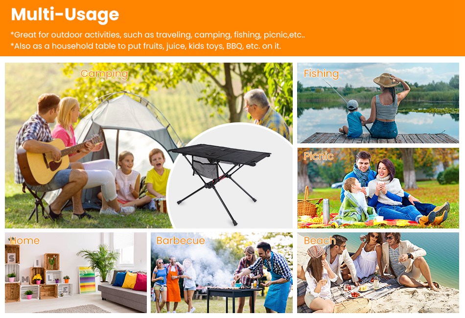 - Multi-Usage Camping Table:You can take foldable camp table for outdoor activities,such as traveling,camping,fishing,festival,hiking,picnic and so on,also can regard it as a household table to put fruits,juice,kids toys,BBQ,etc.. on it.