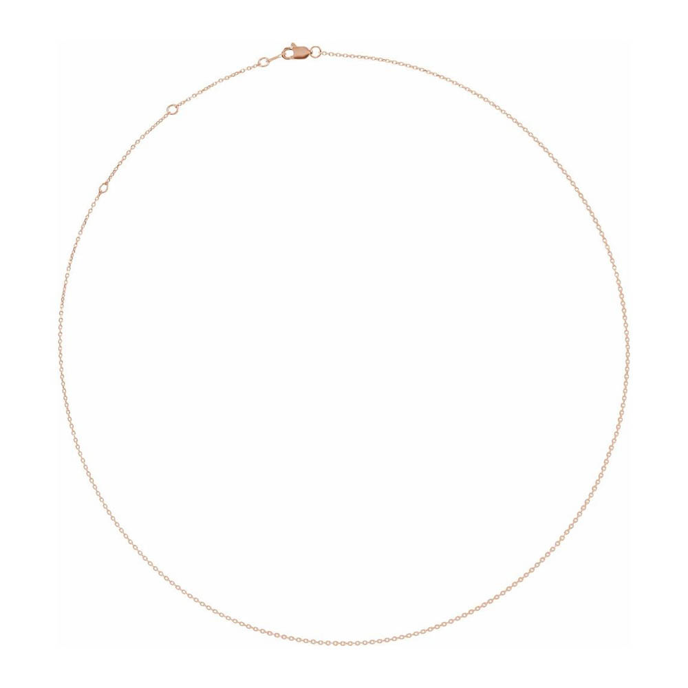 Simple traditional style, round open links of 14k rose gold interlock to form a beautiful cable chain that sparkles and shines in the light thanks to the diamond-cut finish. This solid link, delicate necklace is approximately 1.0 mm in width, 16-inches in length and closes with a lobster claw clasp.