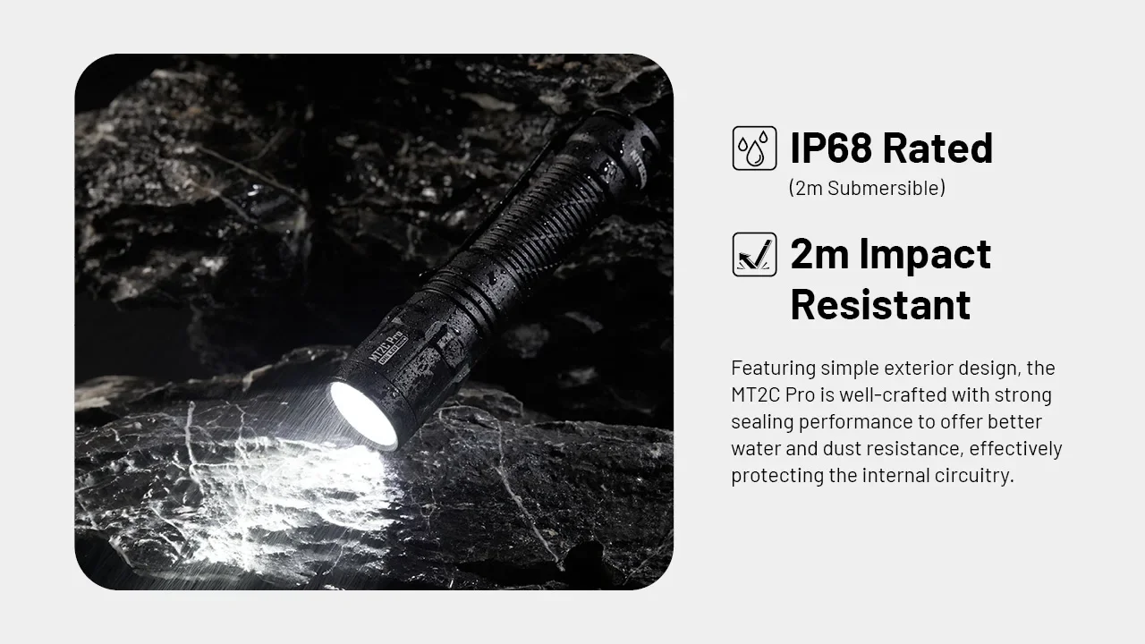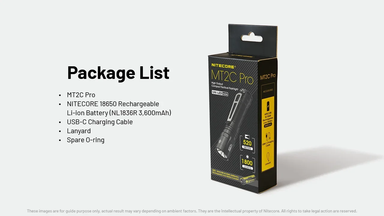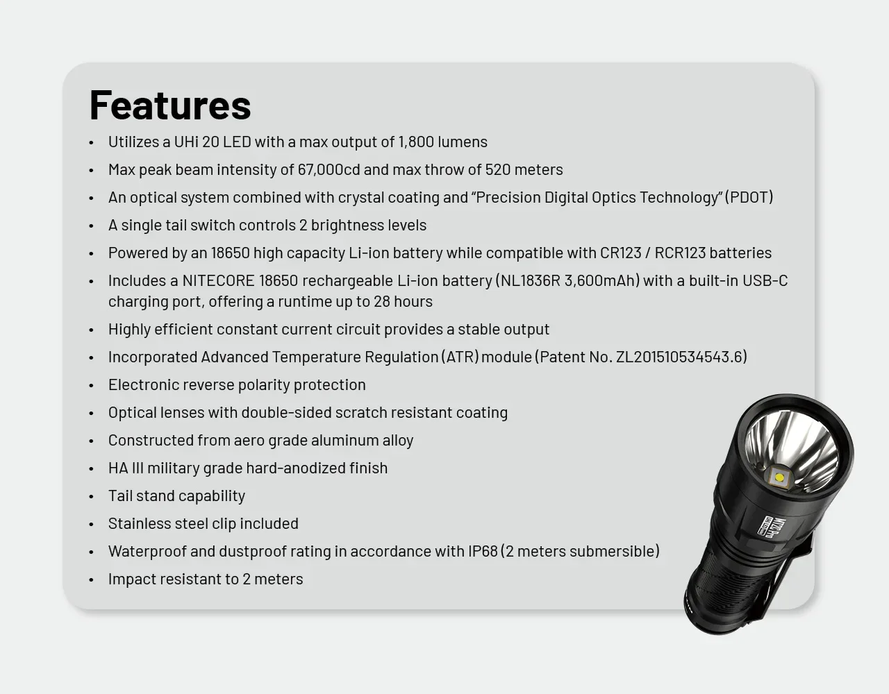 ●Includes a NITECORE 18650 rechargeable Li-ion battery (NL1836R 3,600mAh) with a built-in USB-C charging port, offering a runtime up to 28 hours
