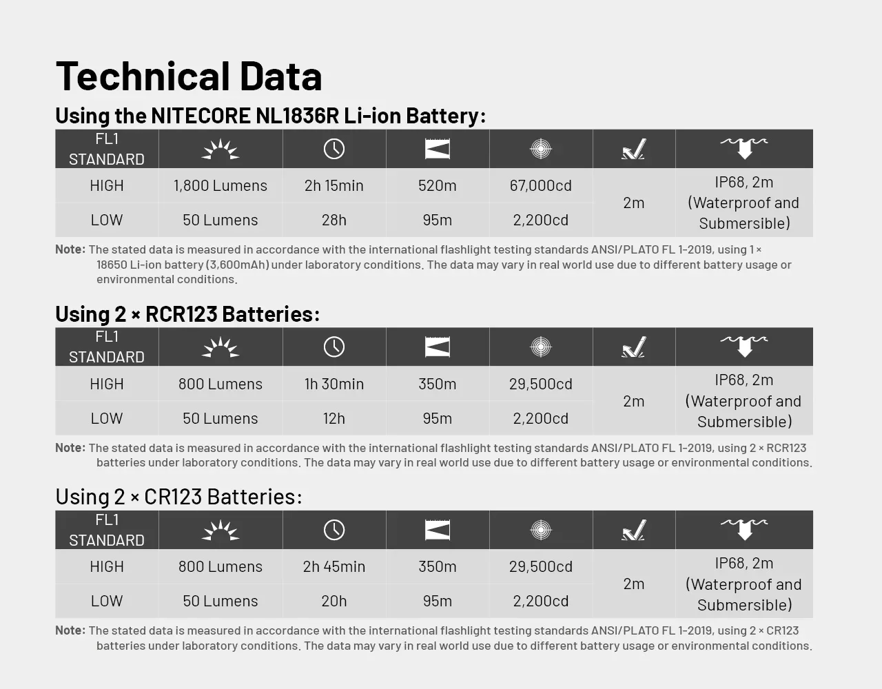 ●Powered by an 18650 high capacity Li-ion battery while compatible with CR123 / RCR123 batteries
