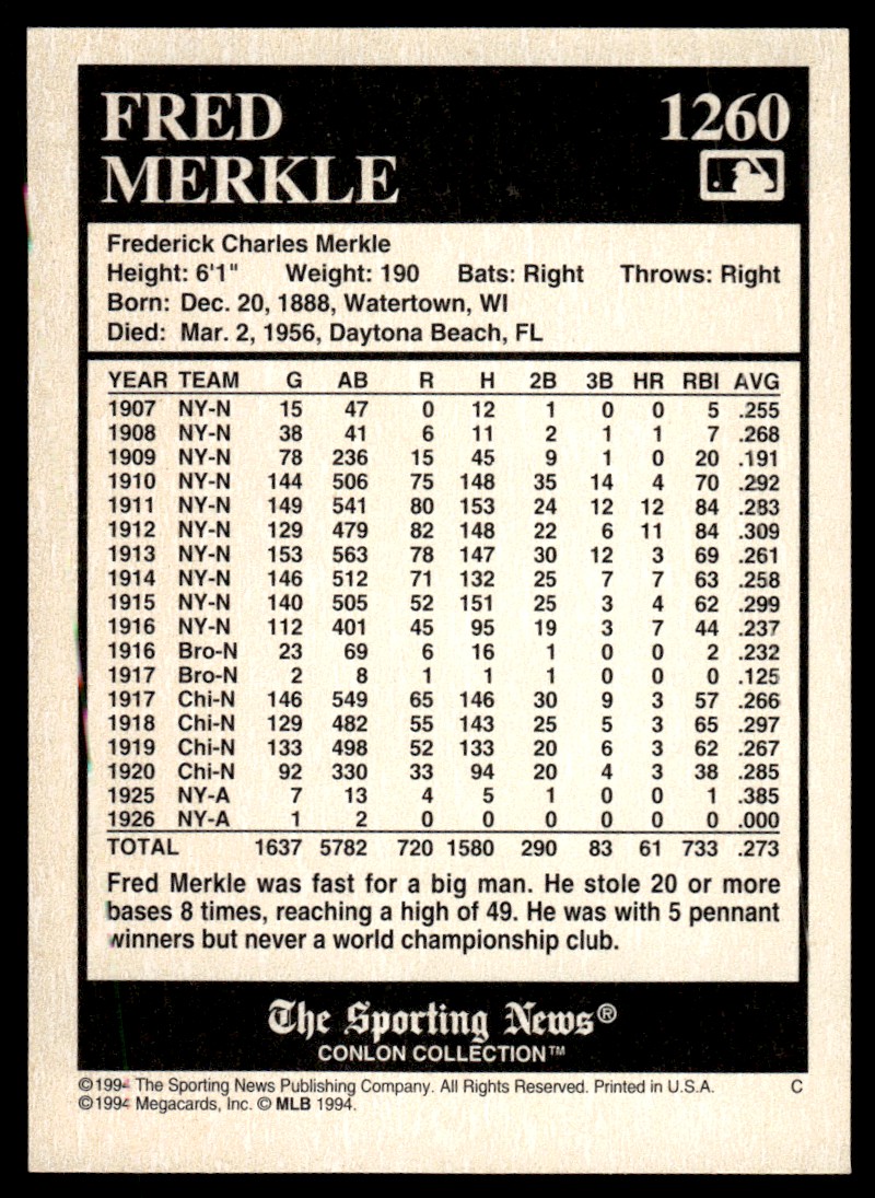 | 1994 Conlon Collection TSN Burgundy Baseball Fred Merkle Brooklyn Dodgers #1260 |