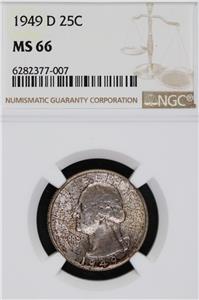 Up for auction is a 1949 D Washington Silver Quarter. This coin is uncirculated and is graded MS66 by NGC. The coin pictured is the one that you will receive. Sorry, but no international shipping. Each additional item ships for $1.00 if paid for in the same payment. Your order will be shipped within 1 day of payment. Thanks for looking and make sure to check out my other listings.