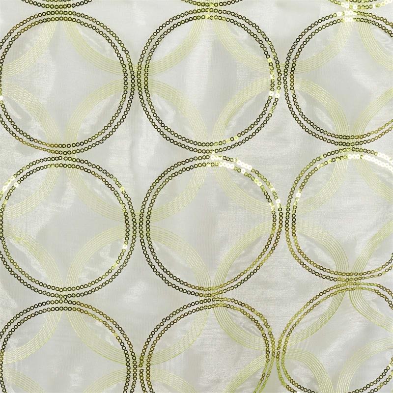 Shiny sequin beads in a circular pattern atop organza fabric.