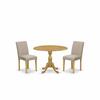 EAST WEST FURNITURE - DMAB3-OAK-04 - 3-Pc KITCHEN TABLE SET Our 3-Piece modern dining table set provides a round dinning table and 2 dining room chairs which can fully accommodate your family. The dining set features a classy and eye catching appearance. This elegant design and Traditional, Oak modern chair are ideal to match any dining room. Improve your interior decor with our antique style dining set. Oak textured finish adds a unique allure to many dining room while the wooden legs of both comfortable chairs and small dining table will surely help you to enhance the solidness and traditional feel. The contemporary style modern dining table set adds a touch of elegance to the kitchen that you and your family will surely enjoy. These modern dining chairs can bring you an incredible relaxing experience because it has a high back and cone-shaped legs. Our dining chairs have Zig Zag springs which are created from two-dimensional S-shaped wires and are also known as No-Sag springs. The high carbon steel springs are good to provide sturdiness to seats in any suspension and support weight. Featuring a smooth surface, this dining table set for 2 is easy to be clean with a wipe down to get hassle-free maintenance. Assembly of our kitchen table set requires little time and it will be easy to assemble if you will follow the step-by-step guidelines. PRODUCT FEATURES: • Fabric Type: Linen Fabric • Linen Fabric Color: Light Tan • Parson Dining Chairs Legs Color: Oak • DiningChair Back Style: High Back • Small Dining Table Top Color: Oak • Wood Table Legs Color: Oak • Dining Chairs Dimension: Length: 22; Width: 21; Height 36. • Dimension of Kitchen Table: Length: 24/42; Width: 42; Height 30. Include in this Dining Room Table Set- 1 Dropleaf Kitchen Table and Chairs and 2 dining chairs.