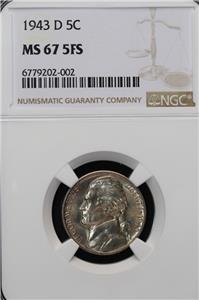 Up for auction is a 1943 D Jefferson Nickel. This coin is uncirculated and is graded MS67 5FS by NGC. The coin pictured is the one that you will receive. Sorry, but no international shipping. Each additional item ships for $1.00 if paid for in the same payment. Your order will be shipped within 1 day of payment. Thanks for looking and make sure to check out my other listings.