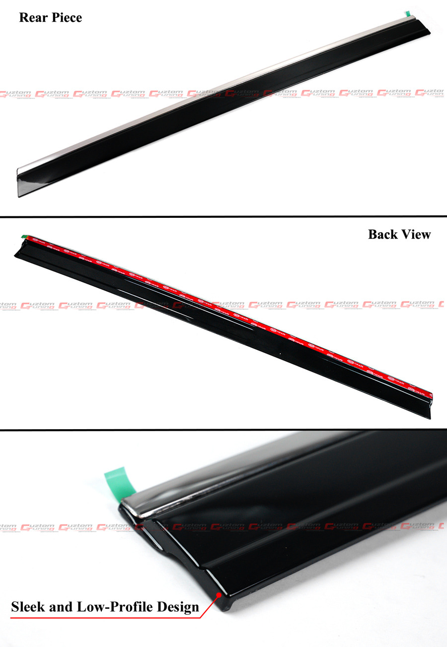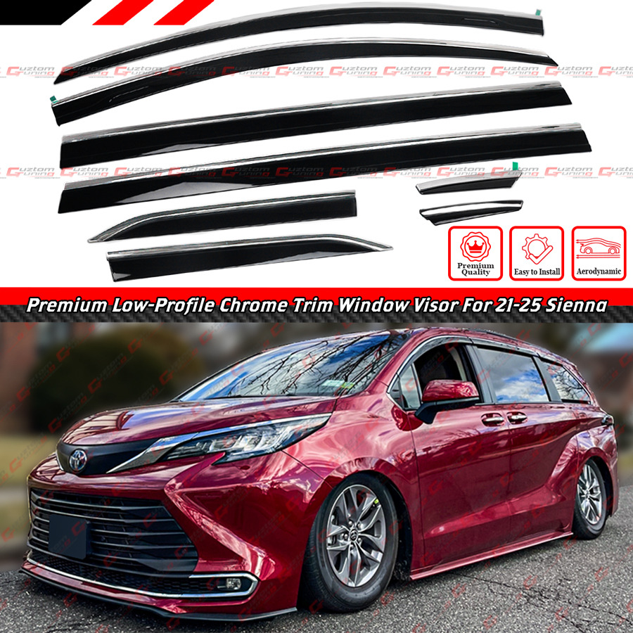 - Cuztomtuning Premium 8-Piece Sleek Low Profile Design Chrome Trim Window Visor Set. These are Full-Length 8 Piece Visor Set That Covers From the Very Front of the Mirror Base to the Rear Quarter Panel. Please Refer to Pictures.